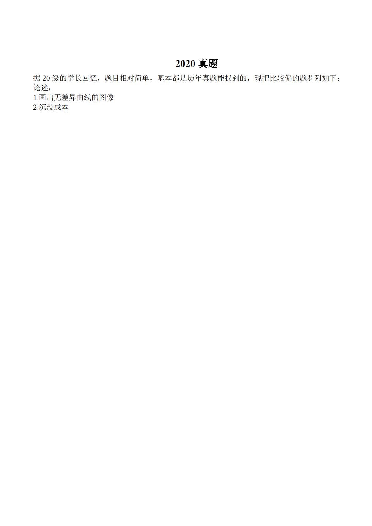 2020真题据20级的学长回忆,题目相对简单,基本都是历年真题能找到的,现把比较偏的题罗列如下:论述:1.画出无差异曲线的图像2.沉没成本36百校文库—海量高校资料共享库百校文库是一个线上大学生专业学习资料共享平台,致力于通过用户自主上传与分享,打造一个涵盖各大高校、各学科门类的免费资源中心。平台已积累50万+套历年真题与100万+条学习文档,覆盖绝大多数高校专业,所有资料均由各大高校学生自主上传。✅资料透明,直观预览新增全站资料目录功能,所有资源分类清晰、一目了然。访问在线目录,即可快速浏览平台资源全貌,了解资料覆盖范围。点击查看实时更新的资源总览:【百校文库最新资料目录】✅严格审核,保障基...