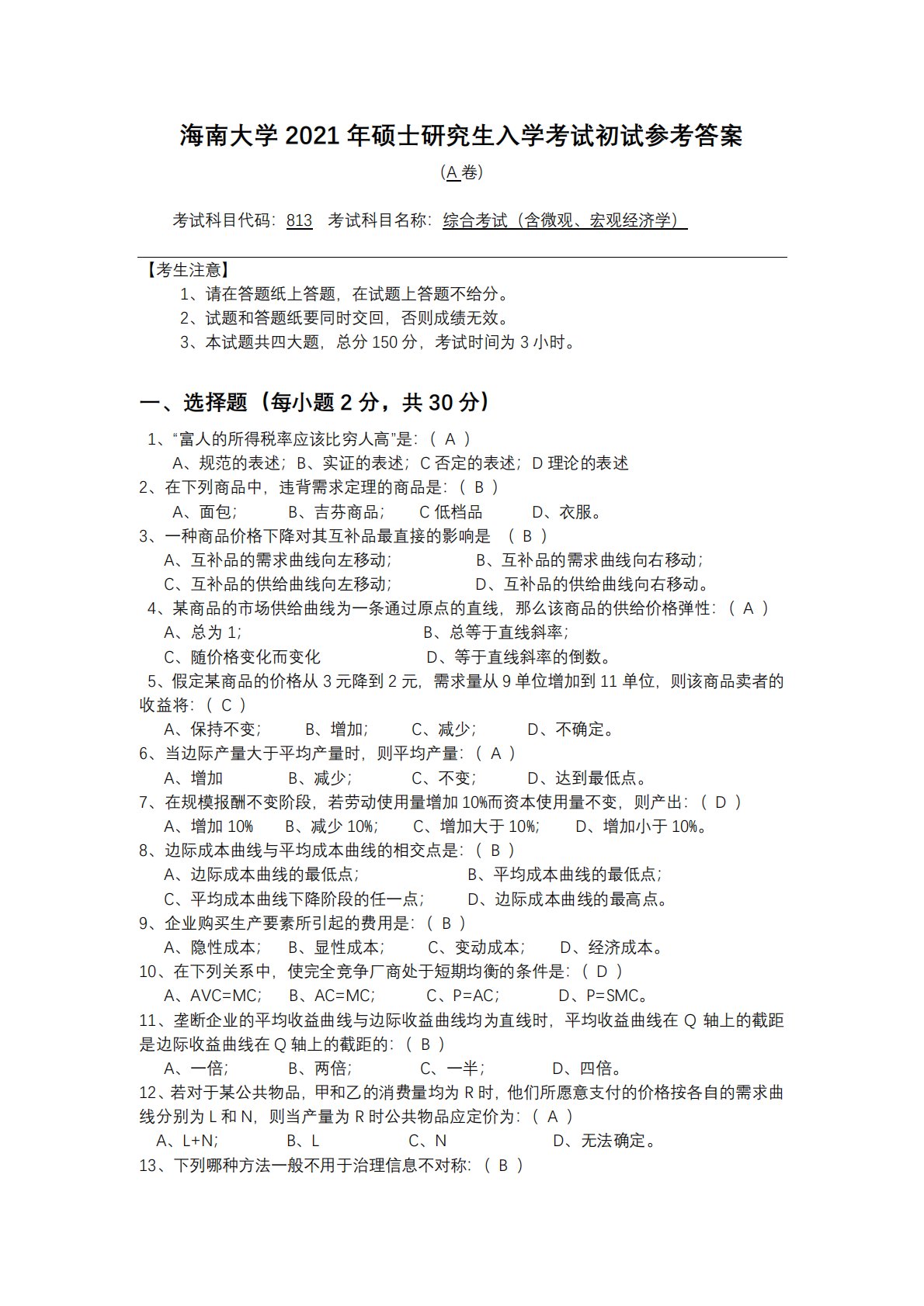 海南大学2021年硕士研究生入学考试初试参考答案(A卷)考试科目代码:813考试科目名称:综合考试(含微观、宏观经济学)【考生注意】1、请在答题纸上答题,在试题上答题不给分。2、试题和答题纸要同时交回,否则成绩无效。3、本试题共四大题,总分150分,考试时间为3小时。一、选择题(每小题2分,共30分)1、“富人的所得税率应该比穷人高”是:(A)A、规范的表述;B、实证的表述;C否定的表述;D理论的表述2、在下列商品中,违背需求定理的商品是:(B)A、面包;B、吉芬商品;C低档品D、衣服。3、一种商品价格下降对其互补品最直接的影响是(B)A、互补品的需求曲线向左移动;B、互补品的需求曲线向右移动...