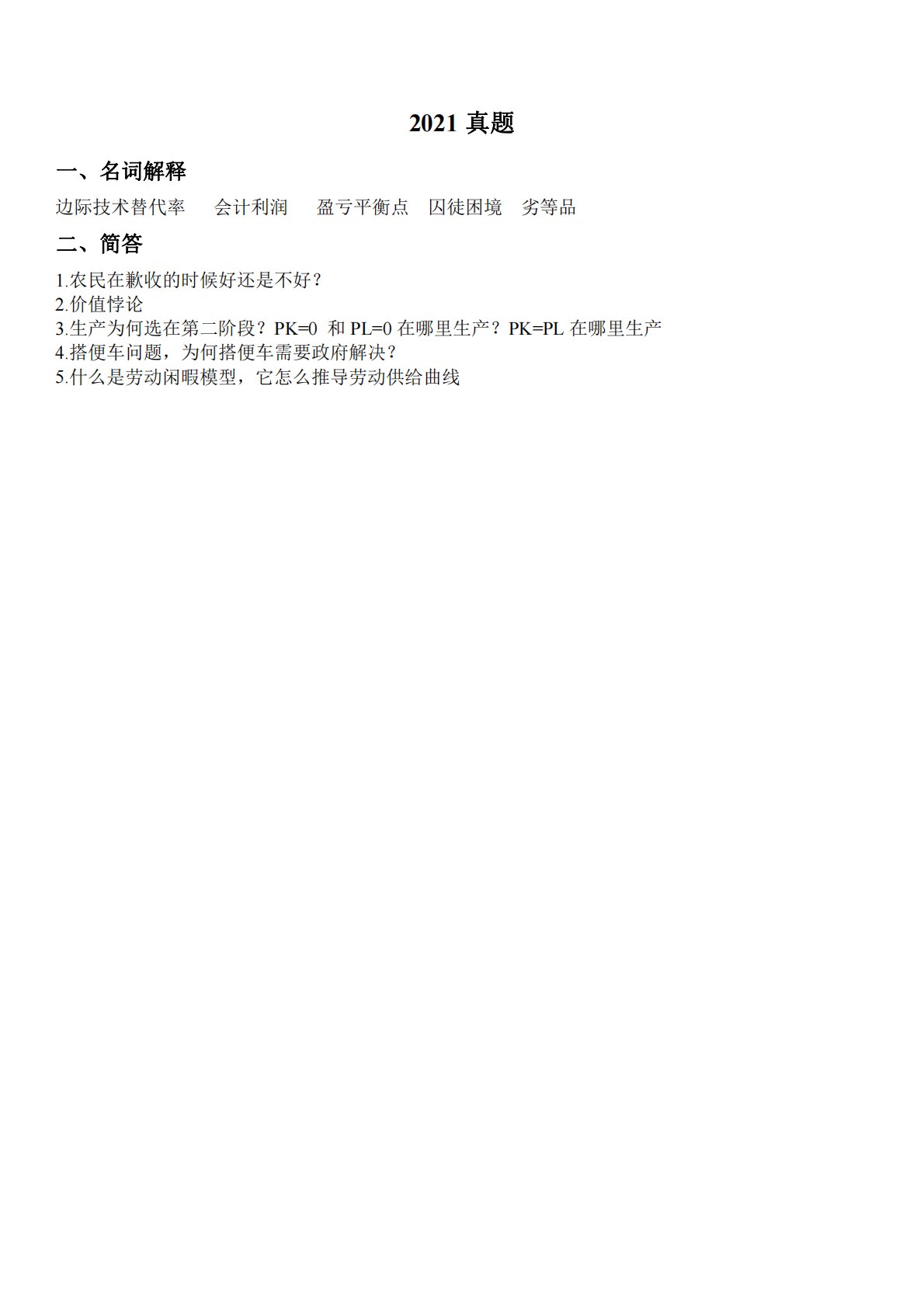 2021真题一、名词解释边际技术替代率会计利润盈亏平衡点囚徒困境劣等品二、简答1.农民在歉收的时候好还是不好?2.价值悖论3.生产为何选在第二阶段?PK=0和PL=0在哪里生产?PK=PL在哪里生产4.搭便车问题,为何搭便车需要政府解决?5.什么是劳动闲暇模型,它怎么推导劳动供给曲线2021真题一、名词解释边际技术替代率会计利润盈亏平衡点囚徒困境劣等品二、简答1.农民在歉收的时候好还是不好?2.价值悖论3.生产为何选在第二阶段?PK=0和PL=0在哪里生产?PK=PL在哪里生产4.搭便车问题,为何搭便车需要政府解决?5.什么是劳动闲暇模型,它怎么推导劳动供给曲线三、计算1、垄断竞争2.垄断市场...
