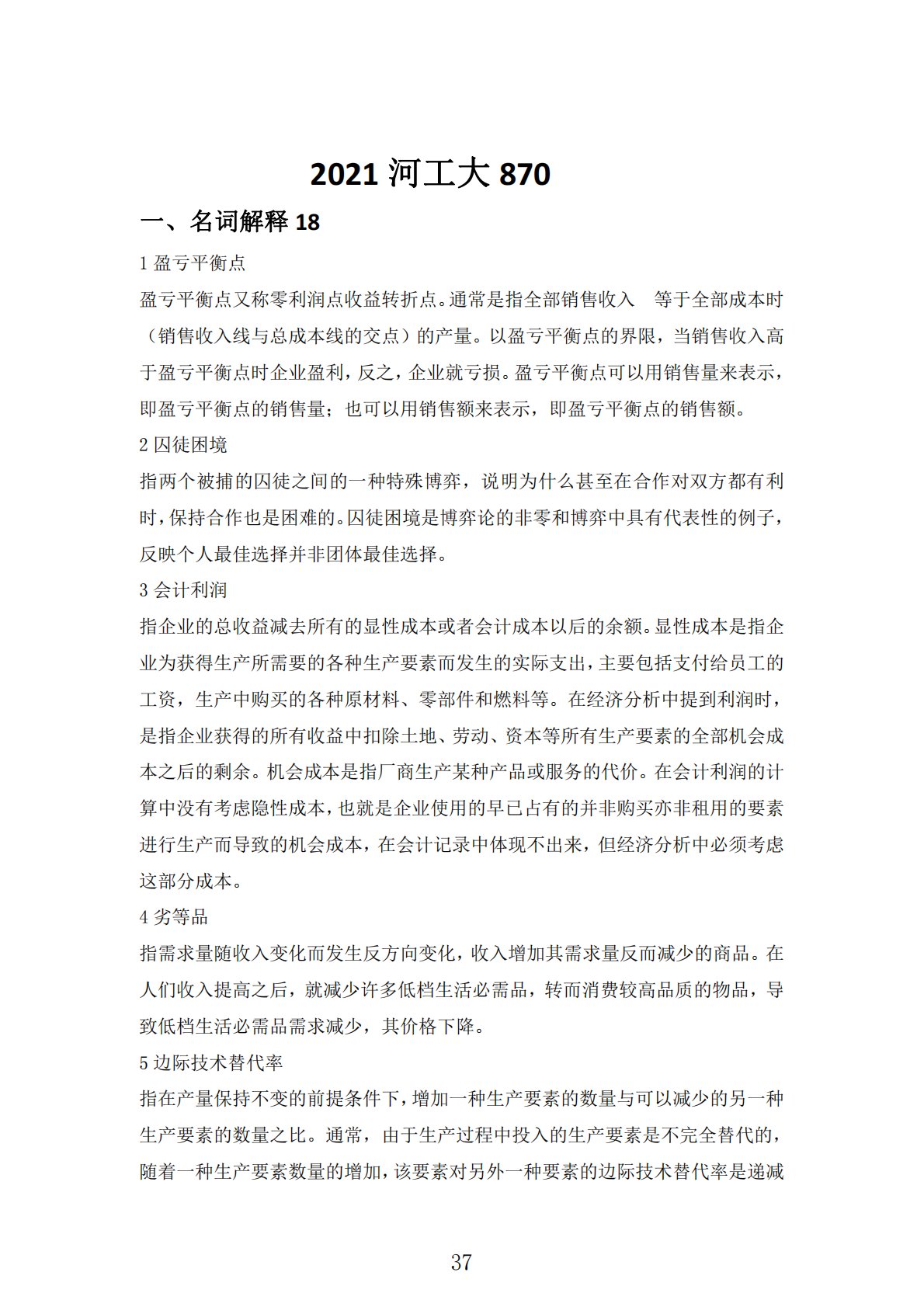 2021河工大870一、名词解释181盈亏平衡点盈亏平衡点又称零利润点收益转折点。通常是指全部销售收入等于全部成本时(销售收入线与总成本线的交点)的产量。以盈亏平衡点的界限,当销售收入高于盈亏平衡点时企业盈利,反之,企业就亏损。盈亏平衡点可以用销售量来表示,即盈亏平衡点的销售量;也可以用销售额来表示,即盈亏平衡点的销售额。2囚徒困境指两个被捕的囚徒之间的一种特殊博弈,说明为什么甚至在合作对双方都有利时,保持合作也是困难的。囚徒困境是博弈论的非零和博弈中具有代表性的例子,反映个人最佳选择并非团体最佳选择。3会计利润指企业的总收益减去所有的显性成本或者会计成本以后的余额。显性成本是指企业为获得生产...