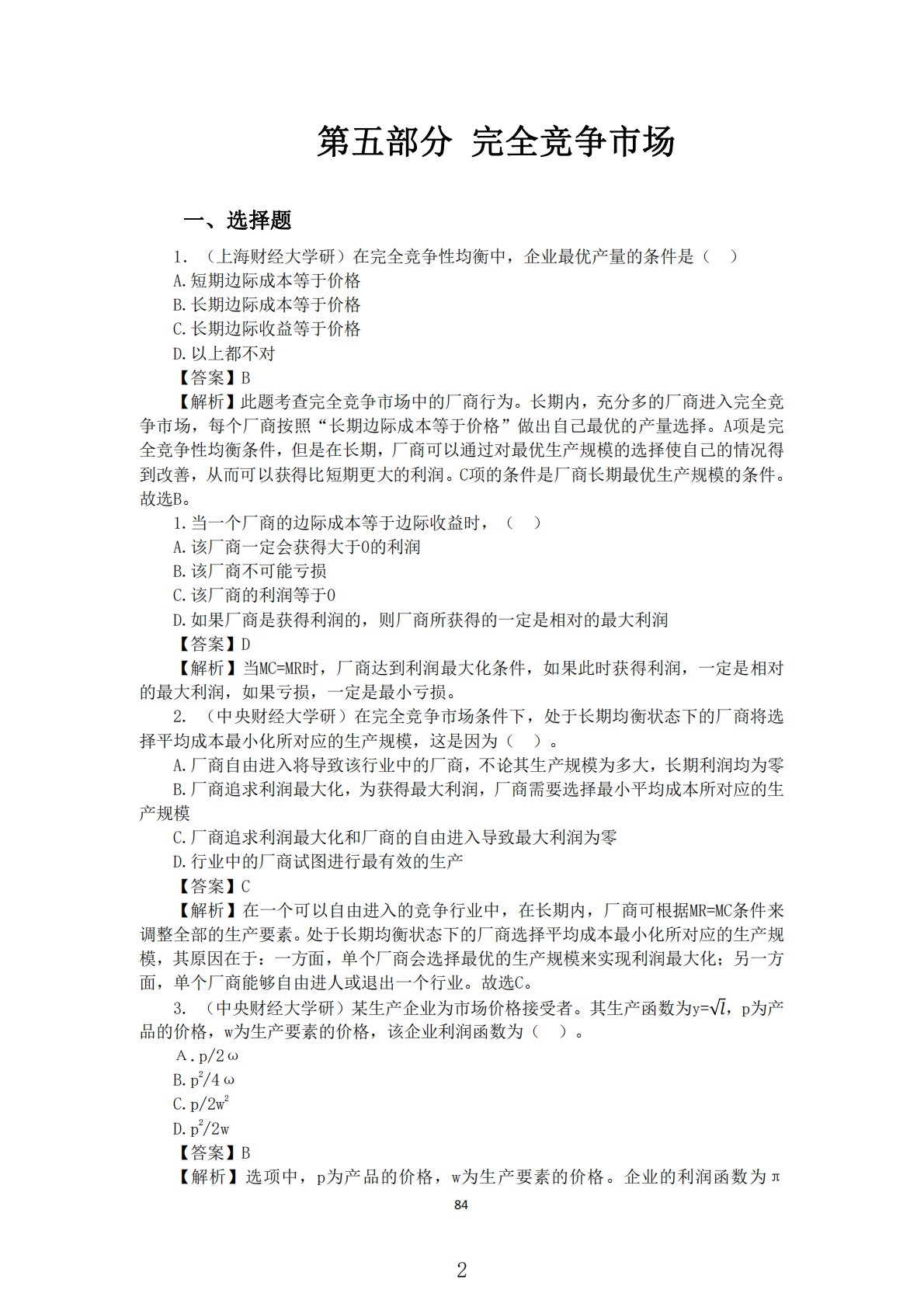 84第五部分完全竞争市场一、选择题1.(上海财经大学研)在完全竞争性均衡中,企业最优产量的条件是()A.短期边际成本等于价格B.长期边际成本等于价格C.长期边际收益等于价格D.以上都不对【答案】B【解析】此题考查完全竞争市场中的厂商行为。长期内,充分多的厂商进入完全竞争市场,每个厂商按照“长期边际成本等于价格”做出自己最优的产量选择。A项是完全竞争性均衡条件,但是在长期,厂商可以通过对最优生产规模的选择使自己的情况得到改善,从而可以获得比短期更大的利润。C项的条件是厂商长期最优生产规模的条件。故选B。1.当一个厂商的边际成本等于边际收益时,()A.该厂商一定会获得大于0的利润B.该厂商不可能亏...