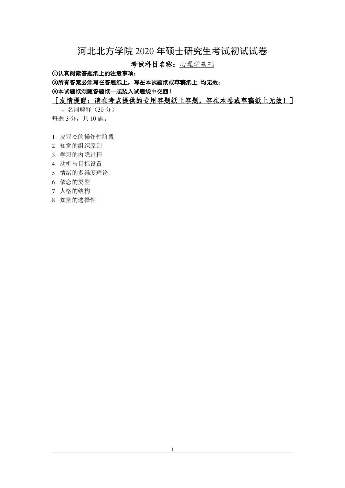 1河北北方学院2020年硕士研究生考试初试试卷考试科目名称:心理学基础①认真阅读答题纸上的注意事项;②所有答案必须写在答题纸上,写在本试题纸或草稿纸上均无效;③本试题纸须随答题纸一起装入试题袋中交回![友情提醒:请在考点提供的专用答题纸上答题,答在本卷或草稿纸上无效!]一、名词解释(30分)每题3分,共10题。1.皮亚杰的操作性阶段2.知觉的组织原则3.学习的内隐过程4.动机与目标设置5.情绪的多维度理论6.依恋的类型7.人格的结构8.知觉的选择性1河北北方学院2020年硕士研究生考试初试试卷考试科目名称:心理学基础①认真阅读答题纸上的注意事项;②所有答案必须写在答题纸上,写在本试题纸或草稿纸...