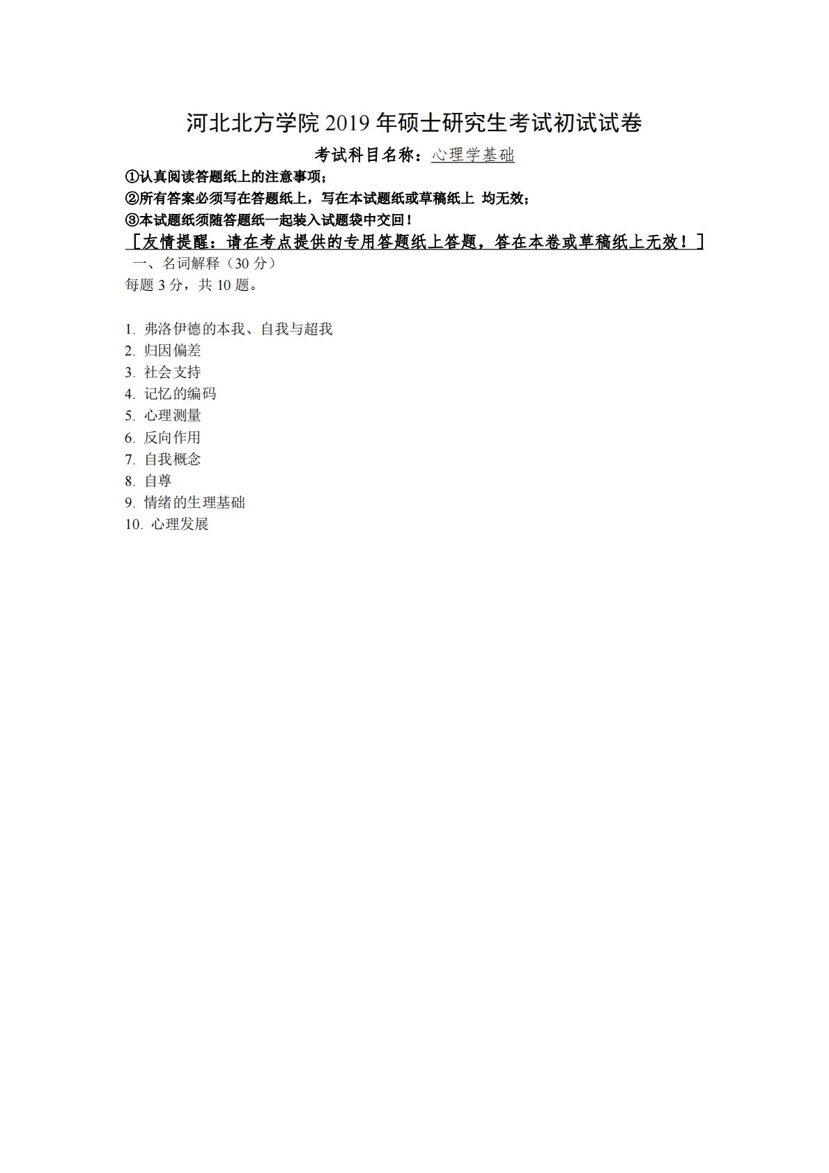 河北北方学院2019年硕士研究生考试初试试卷考试科目名称:心理学基础①认真阅读答题纸上的注意事项;②所有答案必须写在答题纸上,写在本试题纸或草稿纸上均无效;③本试题纸须随答题纸一起装入试题袋中交回![友情提醒:请在考点提供的专用答题纸上答题,答在本卷或草稿纸上无效!]一、名词解释(30分)每题3分,共10题。1.弗洛伊德的本我、自我与超我2.归因偏差3.社会支持4.记忆的编码5.心理测量6.反向作用7.自我概念8.自尊9.情绪的生理基础10.心理发展1河北北方学院2019年硕士研究生考试初试试卷考试科目名称:心理学基础①认真阅读答题纸上的注意事项;②所有答案必须写在答题纸上,写在本试题纸或草稿...