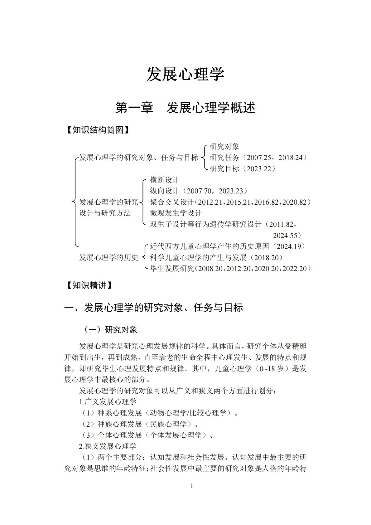 1发展心理学第一章发展心理学概述【知识结构简图】研究对象发展心理学的研究对象、任务与目标研究任务(2007.25,2018.24)研究目标(2023.22)横断设计纵向设计(2007.70,2023.23)发展心理学的研究聚合交叉设计(2012.21,2015.21,2016.82,2020.82)设计与研究方法微观发生学设计双生子设计等行为遗传学研究设计(2011.82,2024.55)近代西方儿童心理学产生的历史原因(2024.19)发展心理学的历史科学儿童心理学的产生与发展(2018.20)毕生发展研究(2008.20,2012.20,2020.20,2022.20)【知识精讲】一、发展...