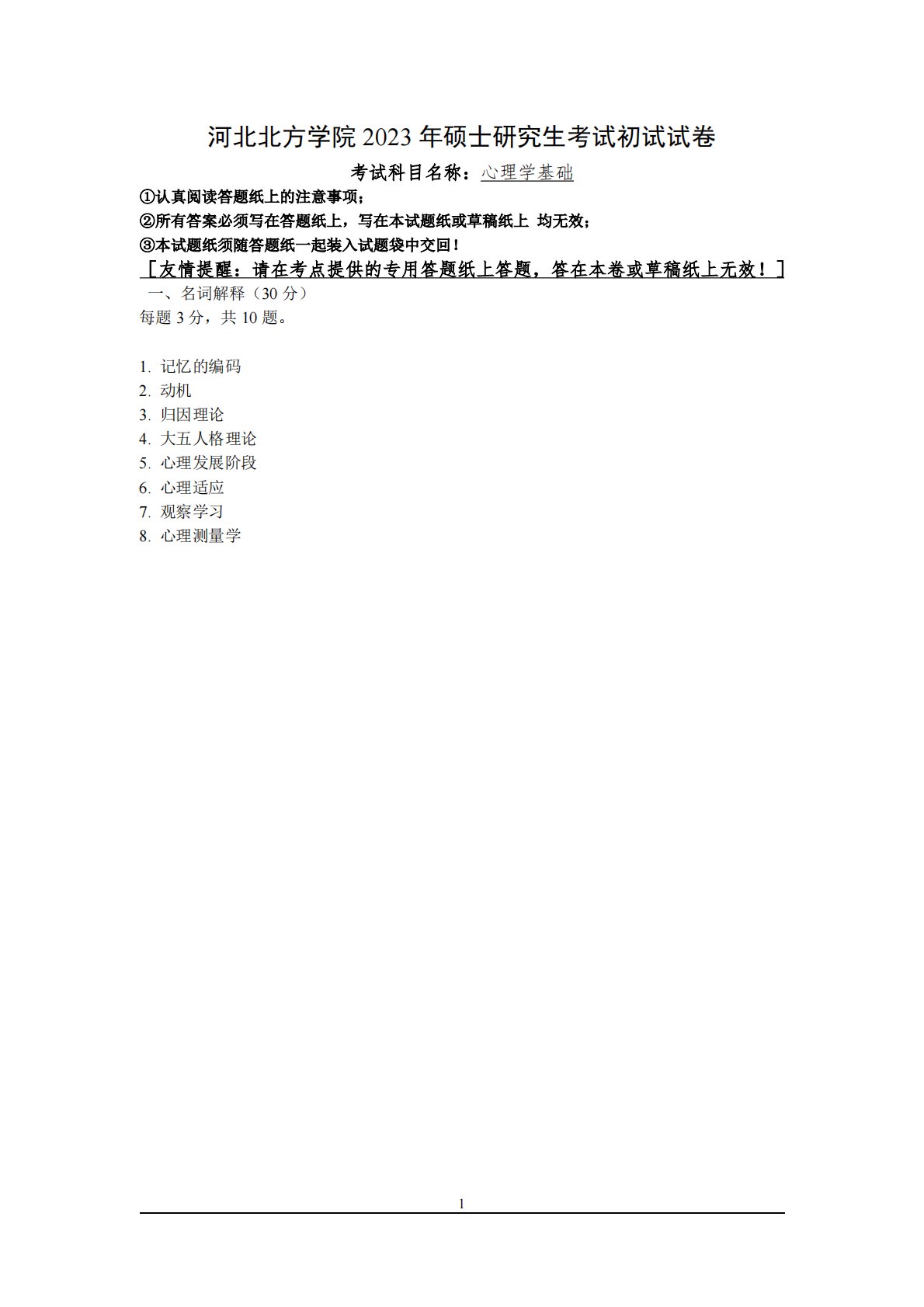 1河北北方学院2023年硕士研究生考试初试试卷考试科目名称:心理学基础①认真阅读答题纸上的注意事项;②所有答案必须写在答题纸上,写在本试题纸或草稿纸上均无效;③本试题纸须随答题纸一起装入试题袋中交回![友情提醒:请在考点提供的专用答题纸上答题,答在本卷或草稿纸上无效!]一、名词解释(30分)每题3分,共10题。1.记忆的编码2.动机3.归因理论4.大五人格理论5.心理发展阶段6.心理适应7.观察学习8.心理测量学1河北北方学院2023年硕士研究生考试初试试卷考试科目名称:心理学基础①认真阅读答题纸上的注意事项;②所有答案必须写在答题纸上,写在本试题纸或草稿纸上均无效;③本试题纸须随答题纸一起装...