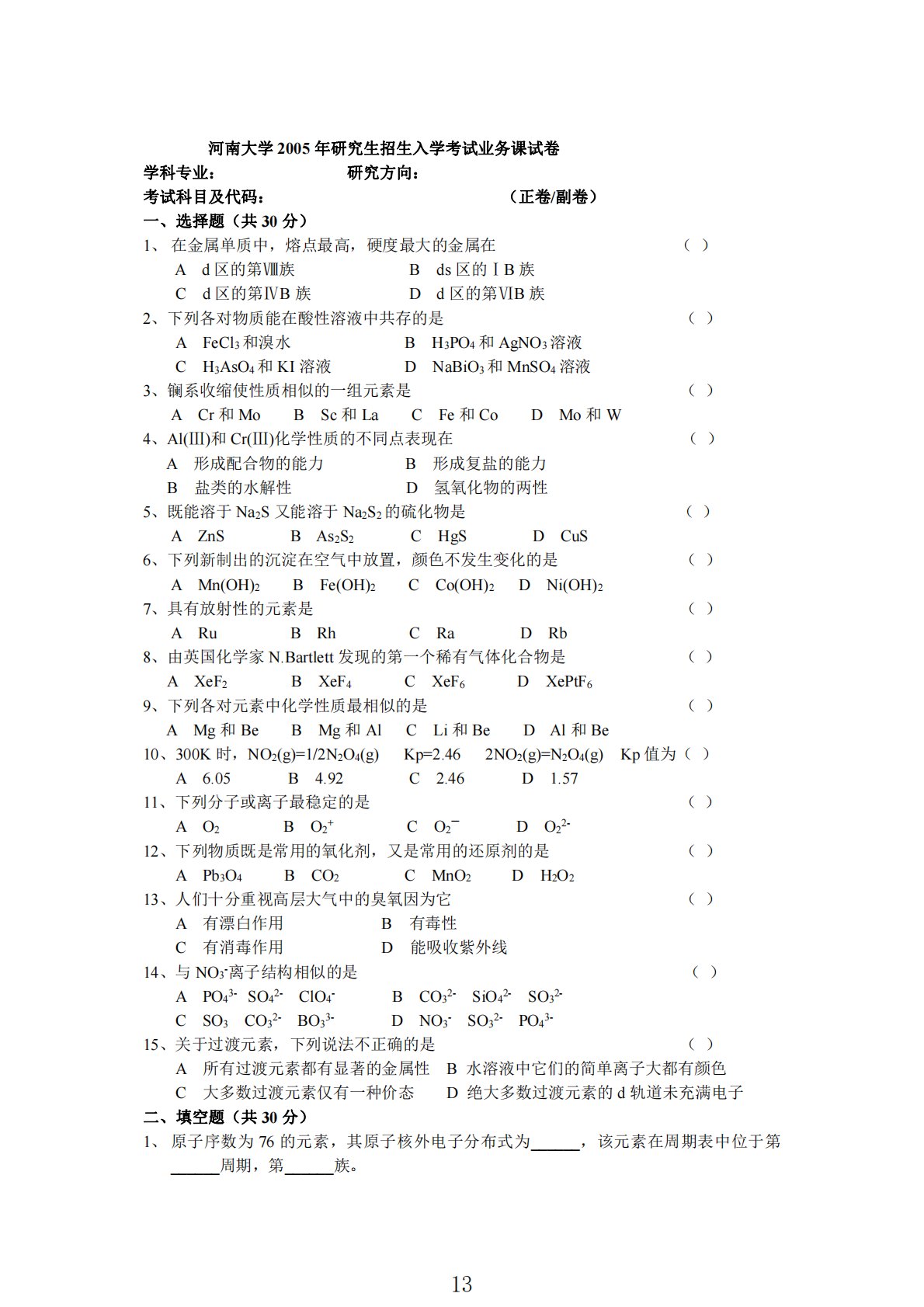 河南大学2005年研究生招生入学考试业务课试卷学科专业:研究方向:考试科目及代码:(正卷/副卷)一、选择题(共30分)1、在金属单质中,熔点最高,硬度最大的金属在()Ad区的第Ⅷ族Bds区的ⅠB族Cd区的第ⅣB族Dd区的第ⅥB族2、下列各对物质能在酸性溶液中共存的是()AFeCl3和溴水BH3PO4和AgNO3溶液CH3AsO4和KI溶液DNaBiO3和MnSO4溶液3、镧系收缩使性质相似的一组元素是()ACr和MoBSc和LaCFe和CoDMo和W4、Al(Ⅲ)和Cr(Ⅲ)化学性质的不同点表现在()A形成配合物的能力B形成复盐的能力B盐类的水解性D氢氧化物的两性5、既能溶于Na2S又能溶于N...