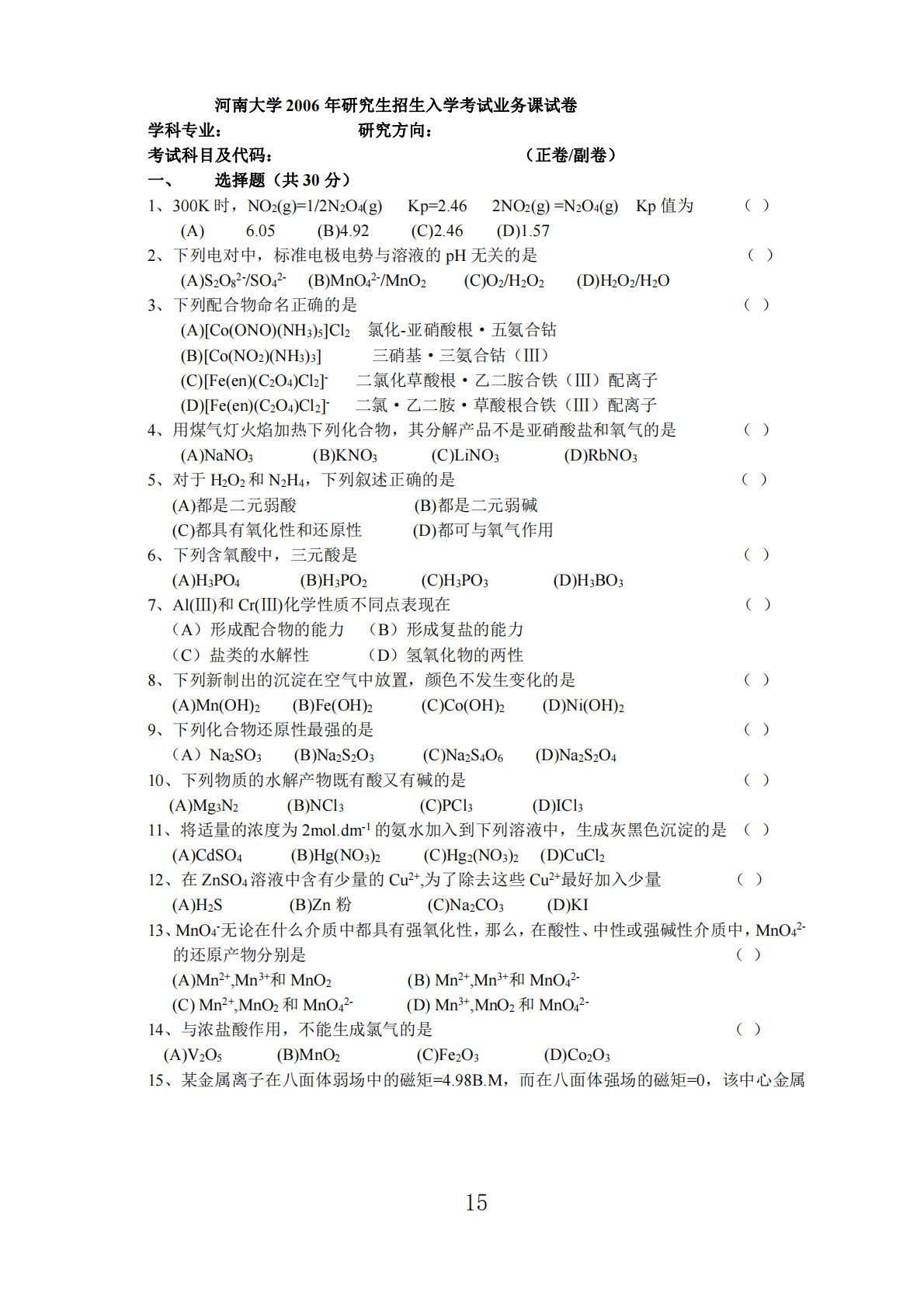 河南大学2006年研究生招生入学考试业务课试卷学科专业:研究方向:考试科目及代码:(正卷/副卷)一、选择题(共30分)1、300K时,NO2(g)=1/2N2O4(g)Kp=2.462NO2(g)=N2O4(g)Kp值为()(A)6.05(B)4.92(C)2.46(D)1.572、下列电对中,标准电极电势与溶液的pH无关的是()(A)S2O82-/SO42-(B)MnO42-/MnO2(C)O2/H2O2(D)H2O2/H2O3、下列配合物命名正确的是()(A)[Co(ONO)(NH3)5]Cl2氯化-亚硝酸根·五氨合钴(B)[Co(NO2)(NH3)3]三硝基·三氨合钴(Ⅲ)(C)[Fe(...