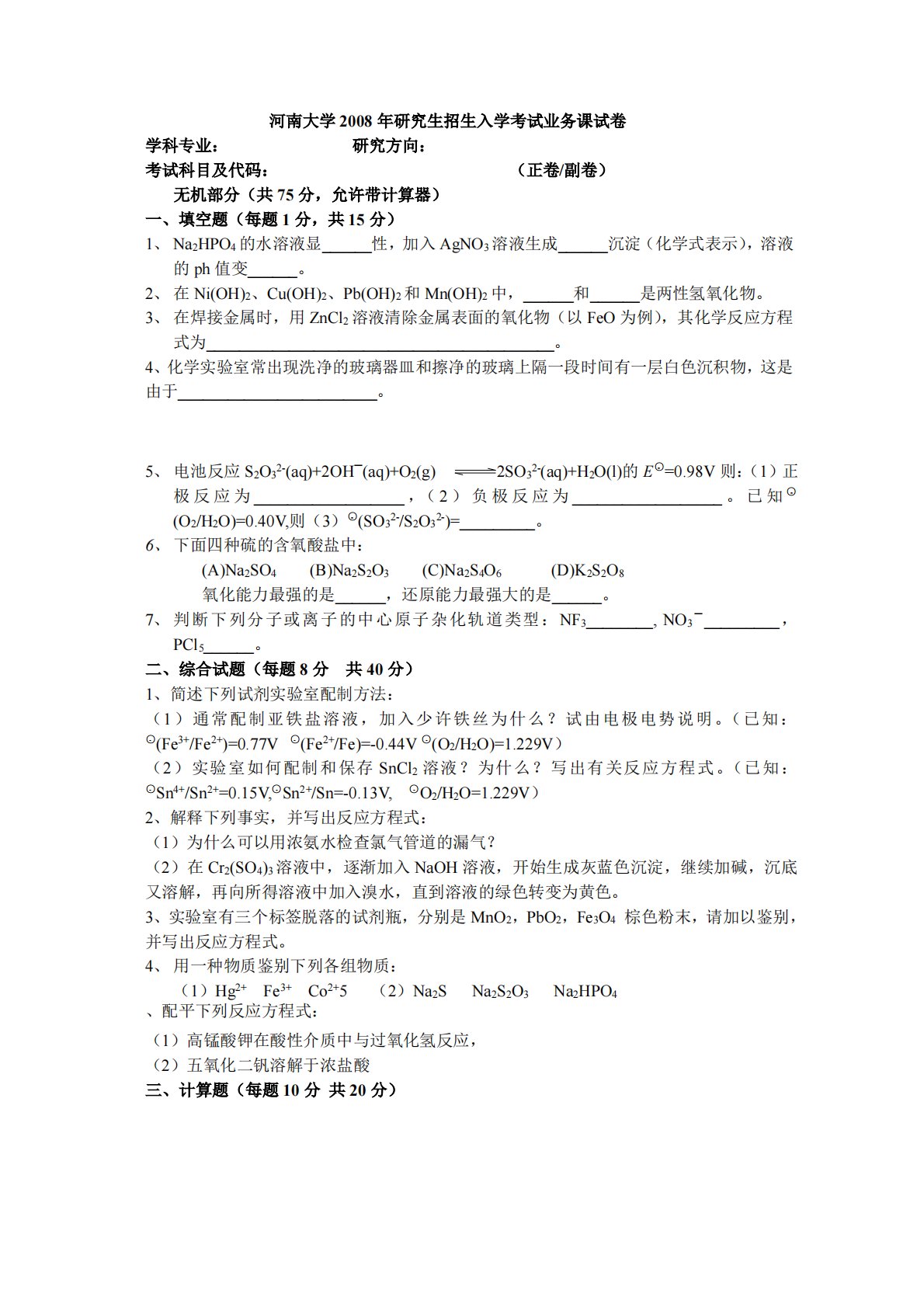 5、电池反应S2O32-(aq)+2OH—(aq)+O2(g)河南大学2008年研究生招生入学考试业务课试卷学科专业:研究方向:考试科目及代码:(正卷/副卷)无机部分(共75分,允许带计算器)一、填空题(每题1分,共15分)1、Na2HPO4的水溶液显______性,加入AgNO3溶液生成______沉淀(化学式表示),溶液的ph值变______。2、在Ni(OH)2、Cu(OH)2、Pb(OH)2和Mn(OH)2中,______和______是两性氢氧化物。3、在焊接金属时,用ZnCl2溶液清除金属表面的氧化物(以FeO为例),其化学反应方程式为_______________________...