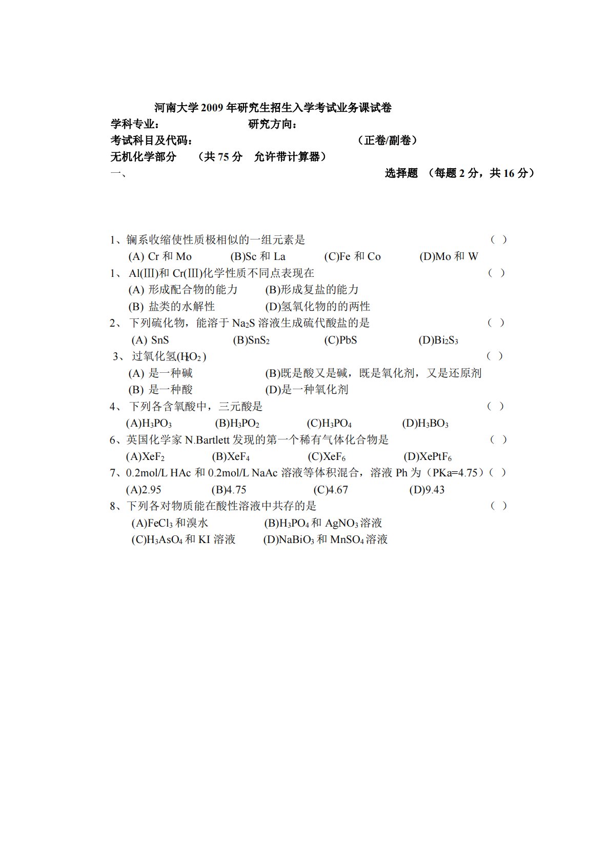 河南大学2009年研究生招生入学考试业务课试卷研究方向:(正卷/副卷)(共75分允许带计算器)学科专业:考试科目及代码:无机化学部分一、选择题(每题2分,共16分)1、镧系收缩使性质极相似的一组元素是()(A)Cr和Mo(B)Sc和La(C)Fe和Co(D)Mo和W1、Al(Ⅲ)和Cr(Ⅲ)化学性质不同点表现在()(A)形成配合物的能力(B)盐类的水解性2、下列硫化物,能溶于Na2(B)形成复盐的能力(D)氢氧化物的的两性S溶液生成硫代酸盐的是()(B)SnS2(C)PbS(D)Bi2S3(A)SnS3、过氧化氢(H2O2)()(B)既是酸又是碱,既是氧化剂,又是还原剂(D)是一种氧化剂(A)...