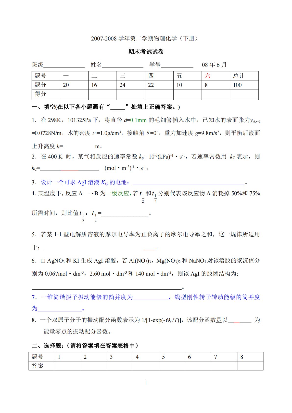 12007-2008学年第二学期物理化学(下册)期末考试试卷班级姓名学号08年6月题号一二三四五六总计题分20162422108100得分一、填空(在以下各小题画有“”处填上正确答案。)1.在298K,101325Pa下,将直径d=0.1mm的毛细管插入水中,已知水的表面张力γ水-气=0.0728N/m,水的密度ρ=1.0g/cm3,接触角θ=0˚,重力加速度g=9.8m/s2,则平衡后液面上升高度h=m。2.在400K时,某气相反应的速率常数kp=10-3(kPa)-1·s-1,若速率常数用kC表示,则kC=(mol·m-3)-1·s-1。3.设计一个可求AgI溶液Ksp的电池:。4.某温度...