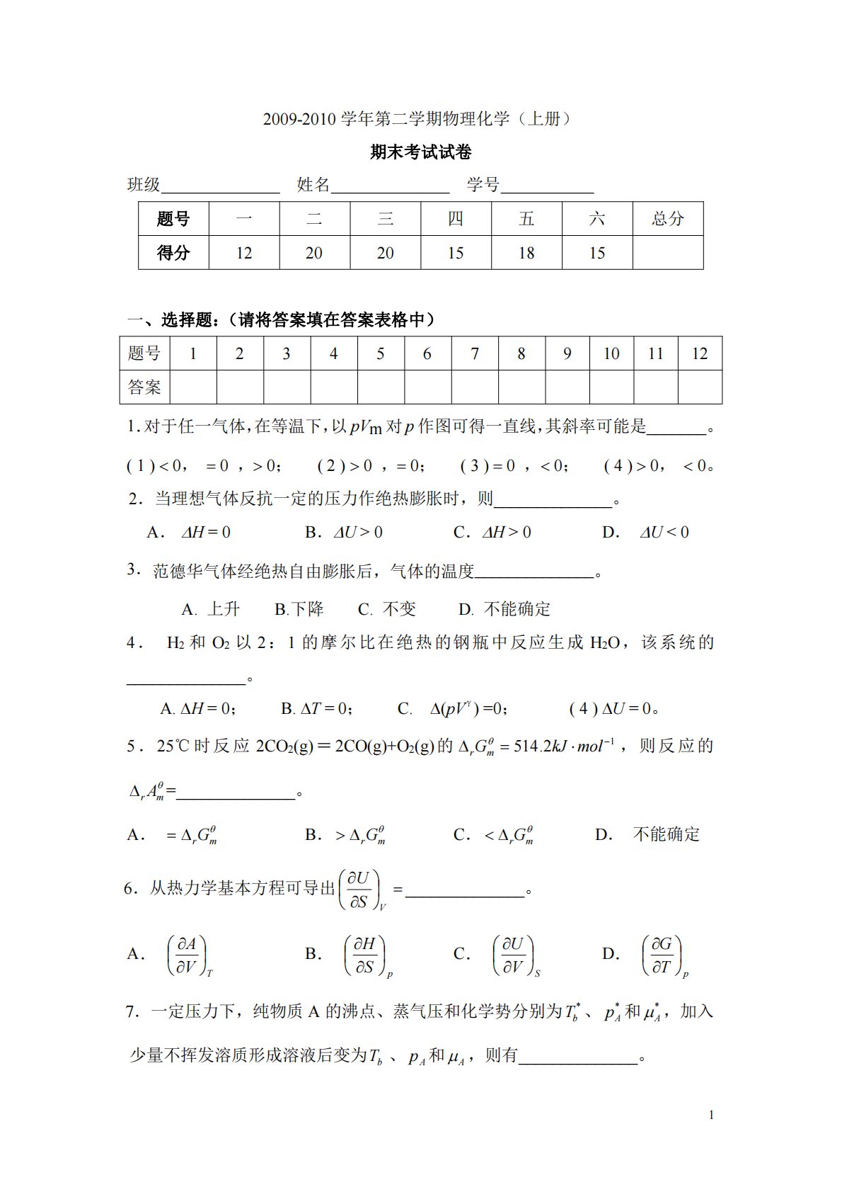 12009-2010学年第二学期物理化学(上册)期末考试试卷班级姓名学号题号一二三四五六总分得分122020151815一、选择题:(请将答案填在答案表格中)题号123456789101112答案1.对于任一气体,在等温下,以pVm对p作图可得一直线,其斜率可能是_______。(1)0,0,0;(2)0,0;(3)0,0;(4)0,0。2.当理想气体反抗一定的压力作绝热膨胀时,则______________。A.H=0B.U>0C.H>0D.U