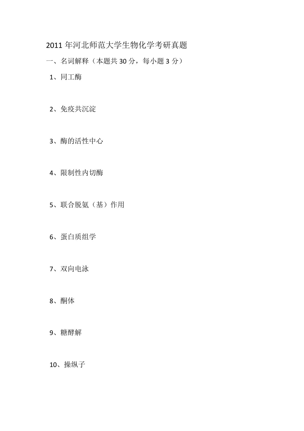 2011年河北师范大学生物化学考研真题名词解释(本题共30分,每小题3分)1、同工酶2、免疫共沉淀3、酶的活性中心4、限制性内切酶5、联合脱氨(基)作用6、蛋白质组学7、双向电泳8、酮体9、糖酵解10、操纵子填空(本题共30分,每空1分)1、含有羟基的氨基酸是、。2、DNA复制时,一条链的合成方向与致,称为,其合成是连续的。另一条链与相反,称为,其合成是不连续的。3、使蛋白质沉淀主要是因为破坏了蛋白质分子周围的或。4、糖酵解过程的关键酶是、、。5、影响DNA的Tm值的因素有、、。6、和一碳单位代谢相关的辅助因子有、、。7、PCR反应体系中包含的成分有、、、等。8、NADH呼吸链的部分传递顺序为...