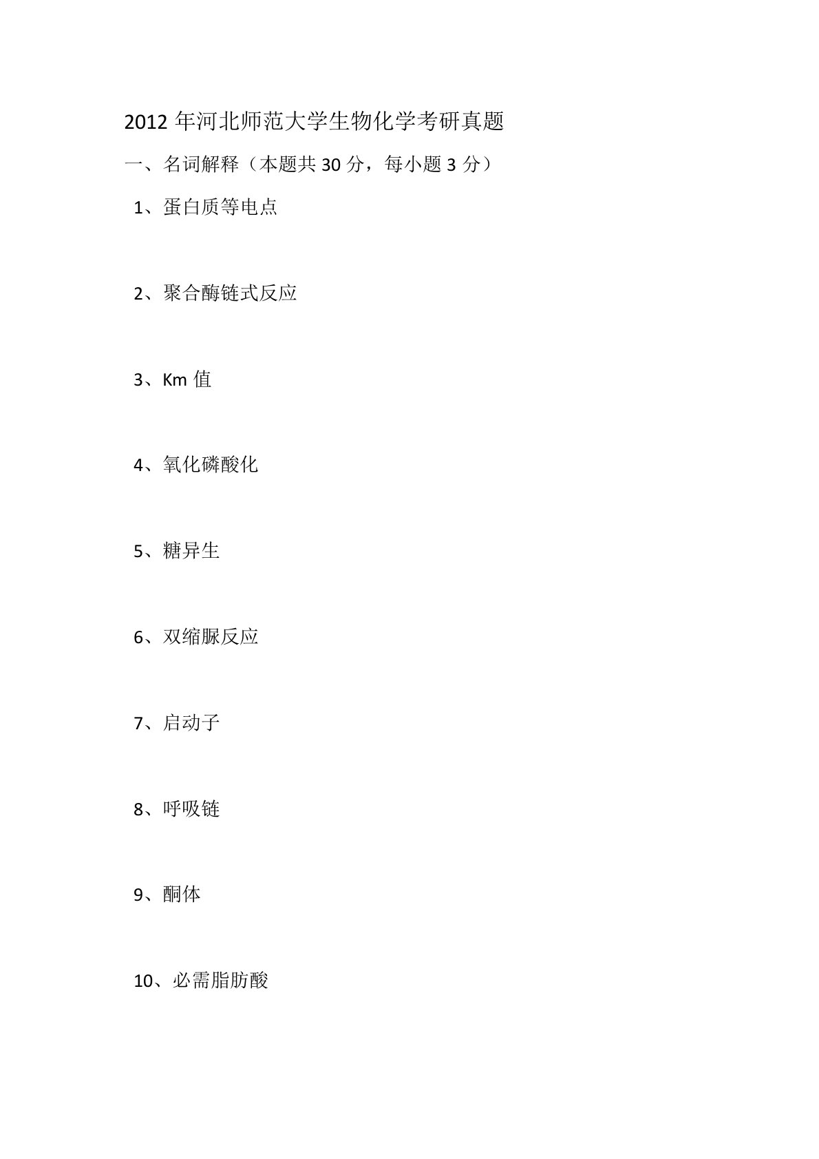 2012年河北师范大学生物化学考研真题名词解释(本题共30分,每小题3分)1、蛋白质等电点2、聚合酶链式反应3、Km值4、氧化磷酸化5、糖异生6、双缩脲反应7、启动子8、呼吸链9、酮体10、必需脂肪酸二、填空(本题共30分,每空1分)1、测定蛋白质含量的方法、、、、等。2、酶的竞争性抑制剂可以使Vamx,Km______,而非竞争性抑制剂可以使Vamx____,Km______反竞争性抑制剂可以使,Vamx____,Km______。3、各种细胞色素在呼吸链中传递电子的顺序是:b→()→()→()→()→O2.4、糖原磷酸化酶b和糖原合成酶b都受到别构调节,前者的别构激活剂是而后者的是。5、柠...