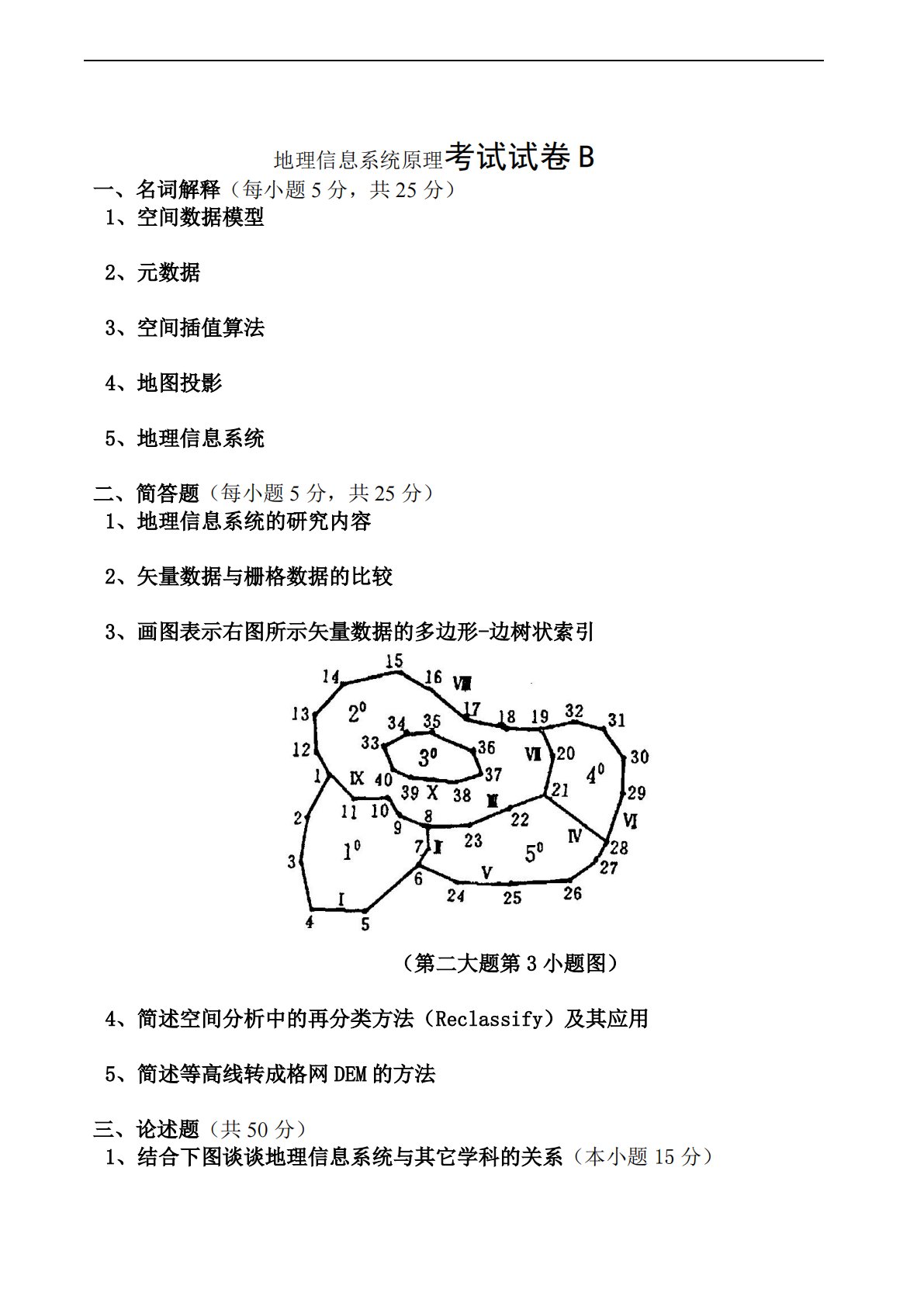一、名词解释(每小题5分,共25分地理信息系统原理考试试卷B)1、空间数据模型2、元数据3、空间插值算法4、地图投影5、地理信息系统二、简答题(每小题5分,共25分)1、地理信息系统的研究内容2、矢量数据与栅格数据的比较3、画图表示右图所示矢量数据的多边形-边树状索引(第二大题第3小题图)4、简述空间分析中的再分类方法(Reclassify)及其应用5、简述等高线转成格网DEM的方法三、论述题(共50分)1、结合下图谈谈地理信息系统与其它学科的关系(本小题15分)2、请就根据所掌握的地理信息系统软件功能和空间分析方法,针对以下两个问题设计解决技术流程(可以采用文字描述和流程图相结合的方法答题)...