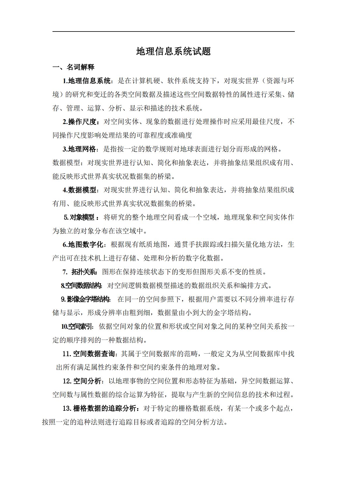 地理信息系统试题一、名词解释1.地理信息系统:是在计算机硬、软件系统支持下,对现实世界(资源与环境)的研究和变迁的各类空间数据及描述这些空间数据特性的属性进行采集、储存、管理、运算、分析、显示和描述的技术系统。2.操作尺度:对空间实体、现象的数据进行处理操作时应采用最佳尺度,不同操作尺度影响处理结果的可靠程度或准确度3.地理网格:是指按一定的数学规则对地球表面进行划分而形成的网格。数据模型:对现实世界进行认知、简化和抽象表达,并将抽象结果组织成有用、能反映形式世界真实状况数据集的桥梁。4.数据模型:对现实世界进行认知、简化和抽象表达,并将抽象结果组织成有用、能反映形式世界真实状况数据集的桥梁。...
