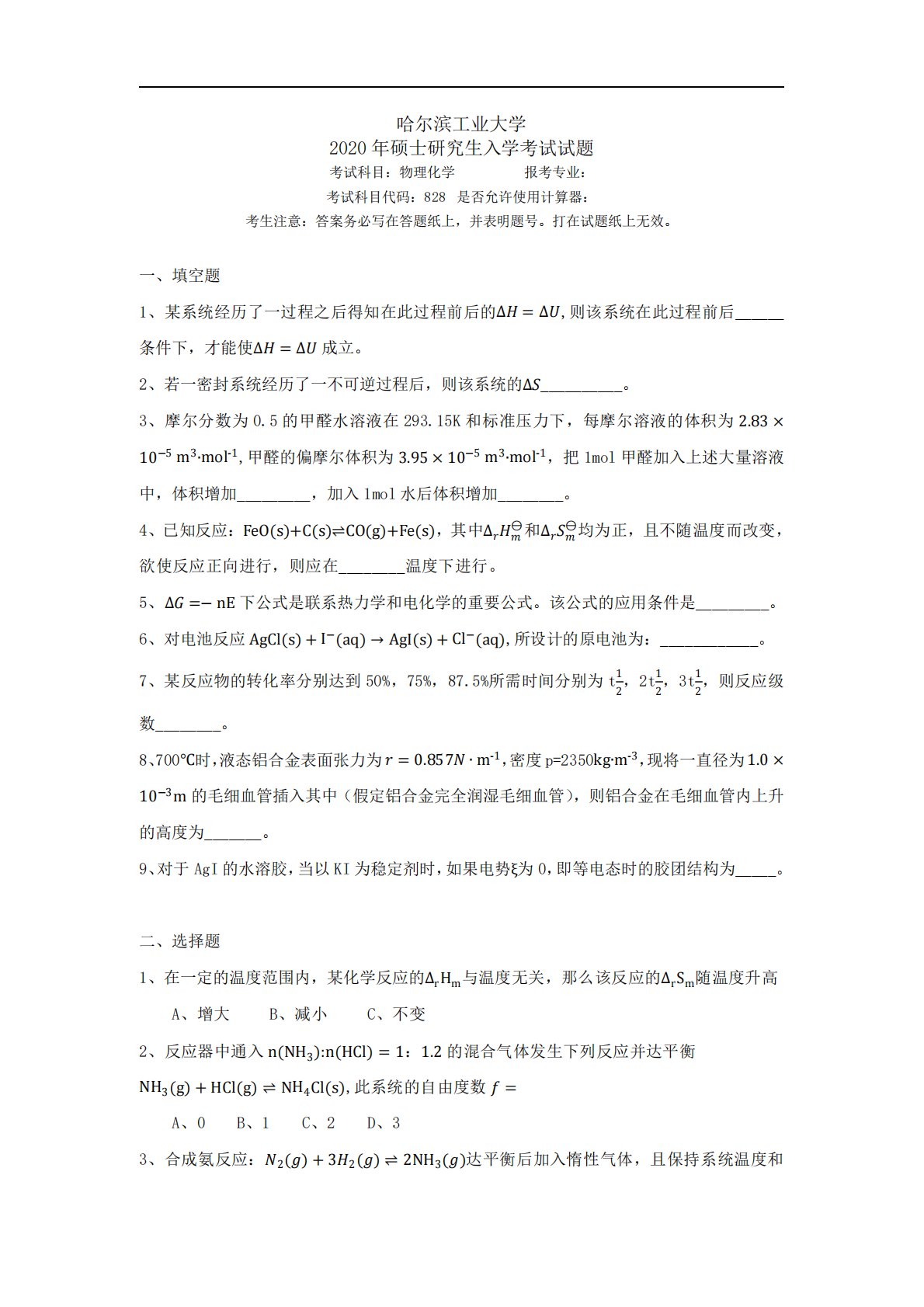 哈尔滨工业大学2020年硕士研究生入学考试试题考试科目:物理化学报考专业:考试科目代码:828是否允许使用计算器:考生注意:答案务必写在答题纸上,并表明题号。打在试题纸上无效。一、填空题1、某系统经历了一过程之后得知在此过程前后的,则该系统在此过程前后______条件下,才能使成立。2、若一密封系统经历了一不可逆过程后,则该系统的__________。3、摩尔分数为0.5的甲醛水溶液在293.15K和标准压力下,每摩尔溶液的体积为tm∙mol-,甲醛的偏摩尔体积为ttm∙mol-,把1mol甲醛加入上述大量溶液中,体积增加_________,加入1mol水后体积增加________。4、已知反...