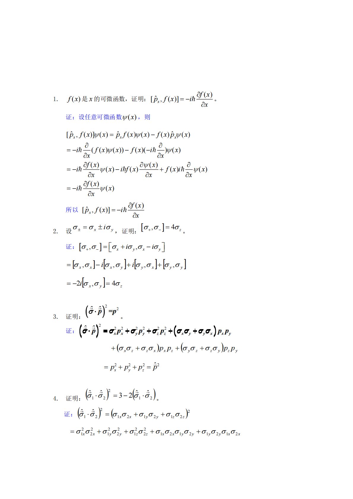 1.f(x)是x的可微函数,证明:=−x[p,f(x)]iˆxf(x)。证:设任意可微函数x(),则=−−+=−x=−ixxxxixifxfxixfxxxx=−ifxx−fx−ixpfxxpfxxfxpxf(x)()()()()()()()(()())()()()[,()]()()()()()ˆˆˆxxx所以=−x[p,f(x)]iˆxf(x)2.设=xiy,证明:+,−4=z。证:iixyxy+,−,=+−+y,y+iy,x−ix,y=x,x=4z=−2ix...