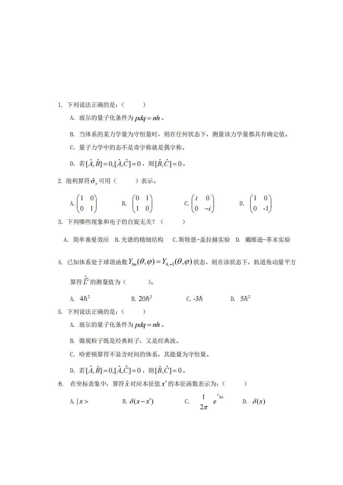 1.下列说法正确的是:()A.玻尔的量子化条件为=pdqnh。B.当体系的某力学量为守恒量时,则在任何状态下,测量该力学量都具有确定值。C.量子力学中的态不是奇宇称就是偶宇称。D.若ABAC[,]0,[,]0ˆˆˆˆ==,则BC[,]0ˆˆ=。2.泡利算符ˆx可用()表示。A.0110B.1001C.i0−i0D.0-1103.下列哪些现象和电子的自旋无关?()C.斯特恩-盖拉赫实验D.戴维逊-革末实验A.简单塞曼效应B.光谱的精细结构4.已知体系处于球谐函数−YYlm(,)(,)=4,3状态,则在该状态下,轨道角动量平方算符Lˆ2的测...