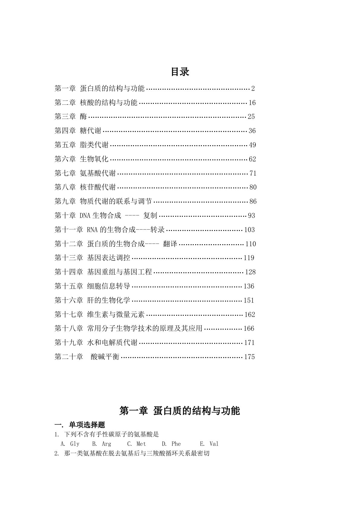 目录第一章蛋白质的结构与功能··············································2第二章核酸的结构与功能················································16第三章酶······································································25第四章糖代谢································································36第五章脂类代谢·······················...
