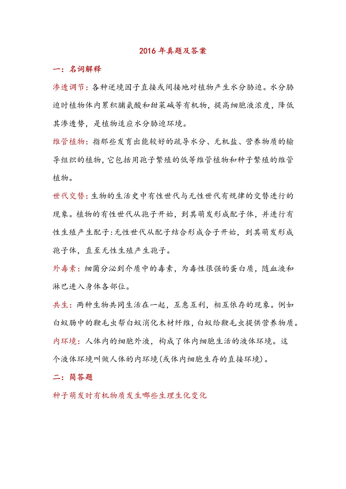2016年真题及答案一:名词解释渗透调节:各种逆境因子直接或间接地对植物产生水分胁迫。水分胁迫时植物体内累积脯氨酸和甜菜碱等有机物,提高细胞液浓度,降低其渗透势,是植物适应水分胁迫环境。维管植物:指那些发育出能较好的疏导水分、无机盐、营养物质的输导组织的植物,它包括用孢子繁殖的低等维管植物和种子繁殖的维管植物。世代交替:生物的生活史中有性世代与无性世代有规律的交替进行的现象。植物的有性世代从孢子开始,到其萌发形成配子体,并进行有性生殖产生配子:无性世代从配子结合形成合子开始,到其萌发形成孢子体,直至无性生殖产生孢子。外毒素:细菌分泌到介质中的毒素,为毒性很强的蛋白质,随血液和淋巴进入身体各部位...