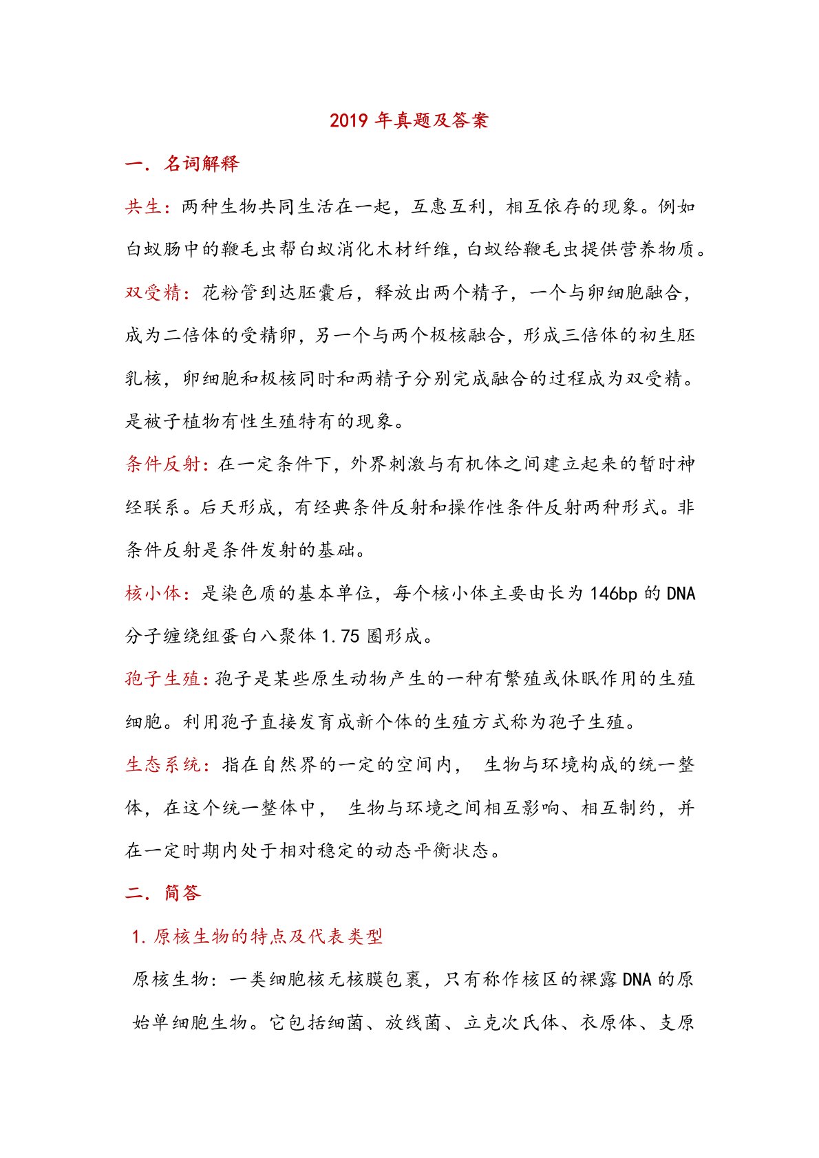 2019年真题及答案名词解释共生:两种生物共同生活在一起,互惠互利,相互依存的现象。例如白蚁肠中的鞭毛虫帮白蚁消化木材纤维,白蚁给鞭毛虫提供营养物质。双受精:花粉管到达胚囊后,释放出两个精子,一个与卵细胞融合,成为二倍体的受精卵,另一个与两个极核融合,形成三倍体的初生胚乳核,卵细胞和极核同时和两精子分别完成融合的过程成为双受精。是被子植物有性生殖特有的现象。条件反射:在一定条件下,外界刺激与有机体之间建立起来的暂时神经联系。后天形成,有经典条件反射和操作性条件反射两种形式。非条件反射是条件发射的基础。核小体:是染色质的基本单位,每个核小体主要由长为146bp的DNA分子缠绕组蛋白八聚体1.75...
