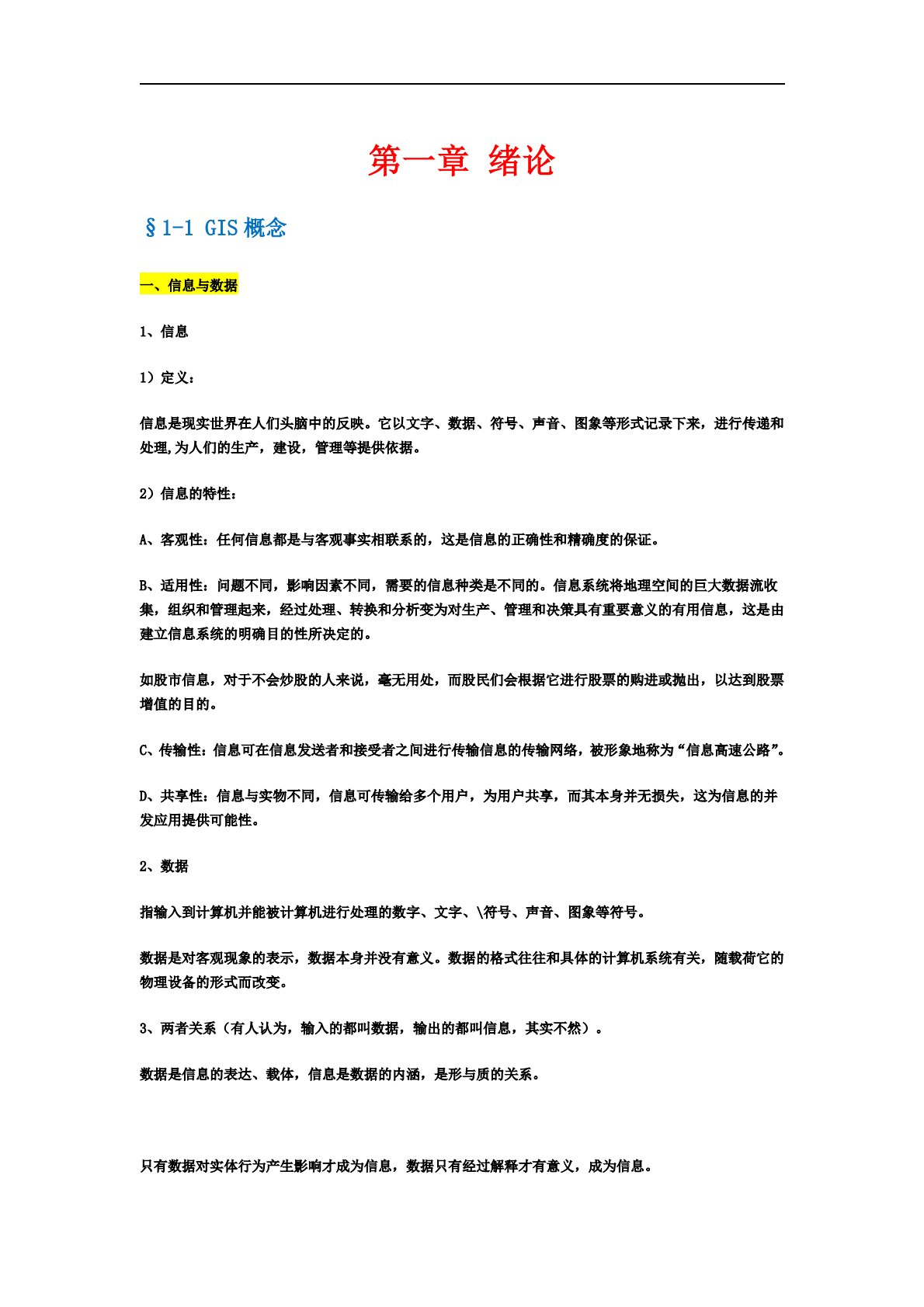 第一章绪论§1-1GIS概念一、信息与数据1、信息1)定义:信息是现实世界在人们头脑中的反映。它以文字、数据、符号、声音、图象等形式记录下来,进行传递和处理,为人们的生产,建设,管理等提供依据。2)信息的特性:A、客观性:任何信息都是与客观事实相联系的,这是信息的正确性和精确度的保证。B、适用性:问题不同,影响因素不同,需要的信息种类是不同的。信息系统将地理空间的巨大数据流收集,组织和管理起来,经过处理、转换和分析变为对生产、管理和决策具有重要意义的有用信息,这是由建立信息系统的明确目的性所决定的。如股市信息,对于不会炒股的人来说,毫无用处,而股民们会根据它进行股票的购进或抛出,以达到股票增值...