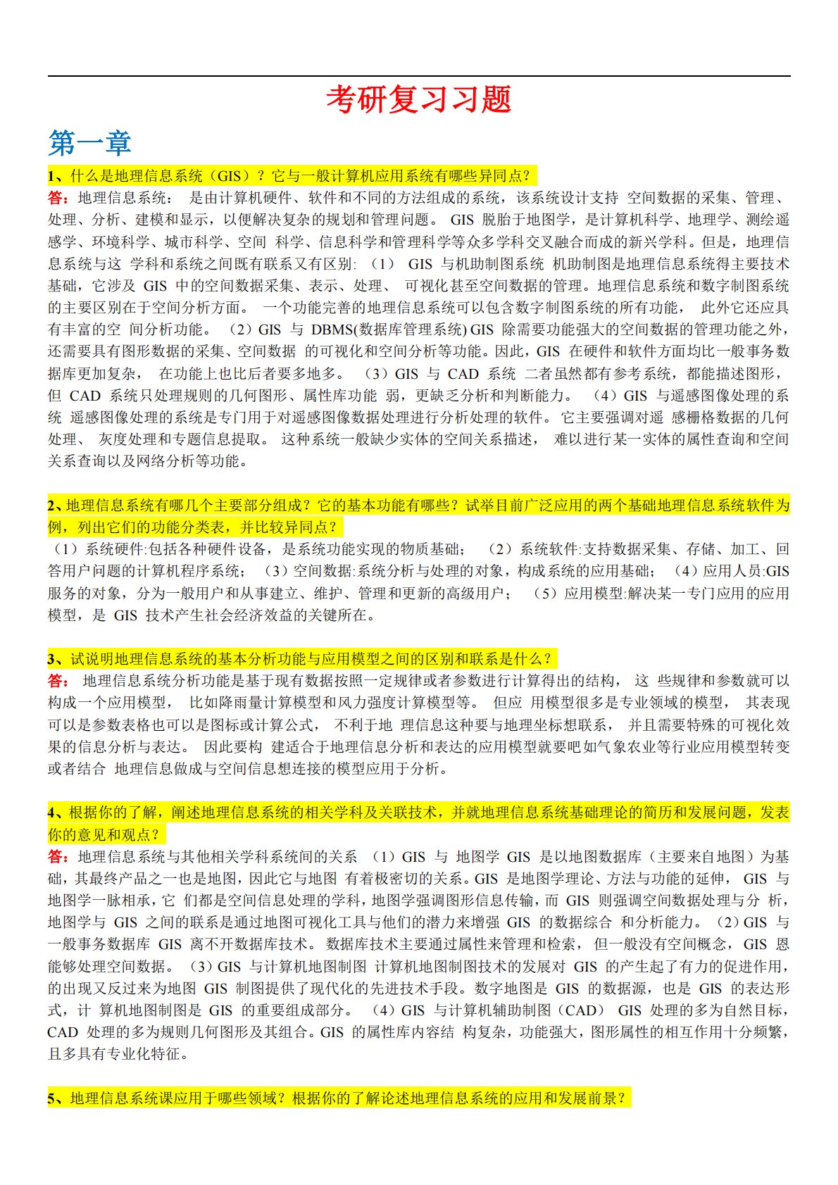 考研复习习题第一章1、什么是地理信息系统(GIS)?它与一般计算机应用系统有哪些异同点?答:地理信息系统:是由计算机硬件、软件和不同的方法组成的系统,该系统设计支持空间数据的采集、管理、处理、分析、建模和显示,以便解决复杂的规划和管理问题。GIS脱胎于地图学,是计算机科学、地理学、测绘遥感学、环境科学、城市科学、空间科学、信息科学和管理科学等众多学科交叉融合而成的新兴学科。但是,地理信息系统与这学科和系统之间既有联系又有区别:(1)GIS与机助制图系统机助制图是地理信息系统得主要技术基础,它涉及GIS中的空间数据采集、表示、处理、可视化甚至空间数据的管理。地理信息系统和数字制图系统的主要区别在...