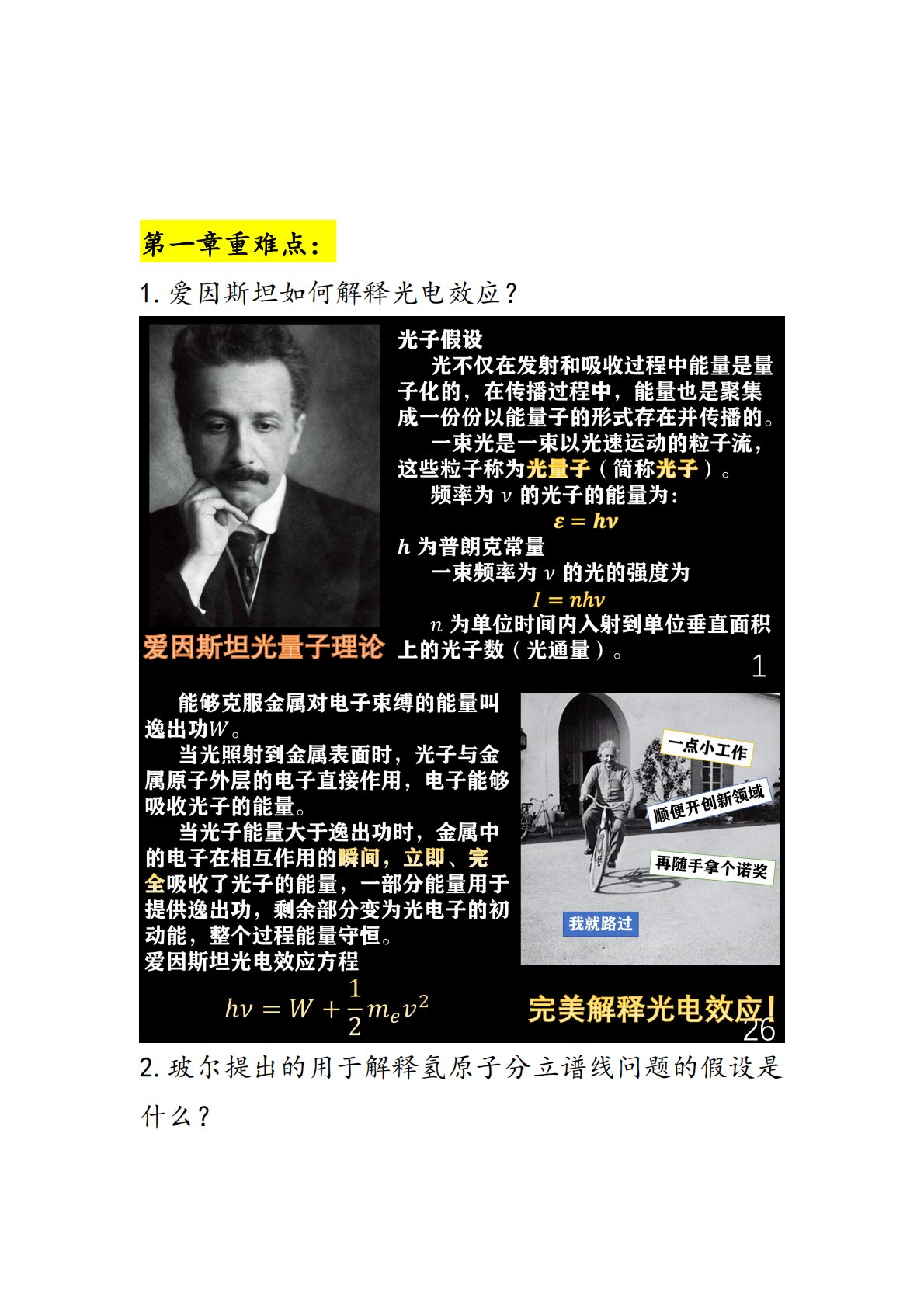第一章重难点:1.爱因斯坦如何解释光电效应?2.玻尔提出的用于解释氢原子分立谱线问题的假设是什么?3.两个光子在一定条件下可以转化为正负电子对。如果两个光子的能量相等,请问要实现这种转化,光子的波长最大是多少?(不是很重点,但是需要看一下)4.量子力学是描述微观粒子在低速状态下的运动规律的理论,为什么量子力学不能描述微观粒子在高速运动时的运动规律?参考薛定谔方程的推导过程(因为薛定谔方程的推导也是从经典出发推导)第二章重难点1.自由粒子波函数2.波恩对物质波波函数的解释3.波函数的标准条件4.什么是归一化,如何归一化5.态叠加原理6.写出薛定谔方程,包括算符形式,微分方程形式,以及式中算符的定...
