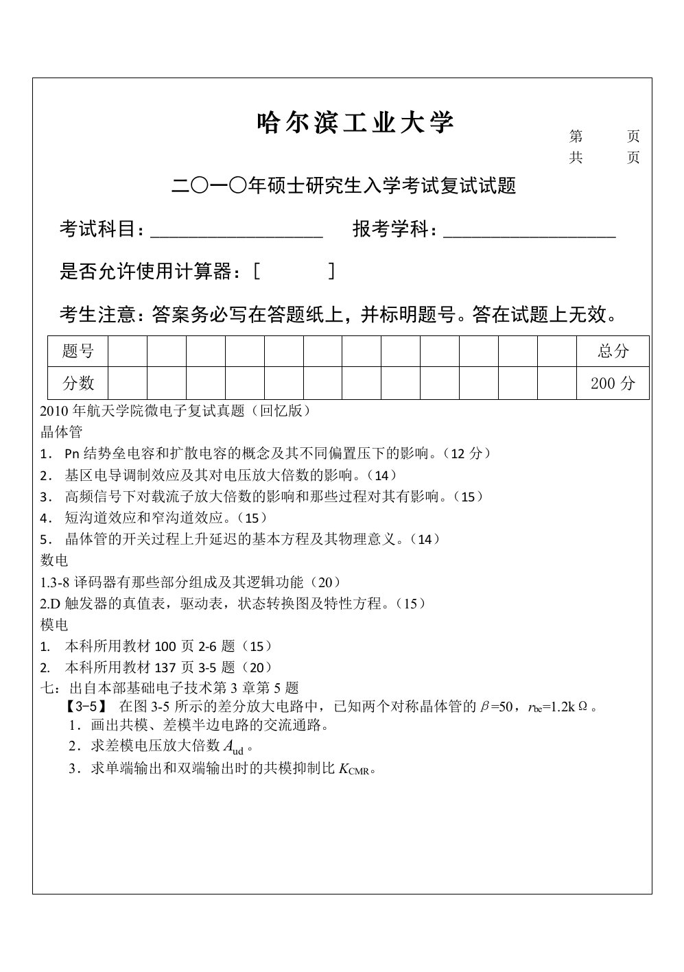 清华大学827电路原理2009年真题