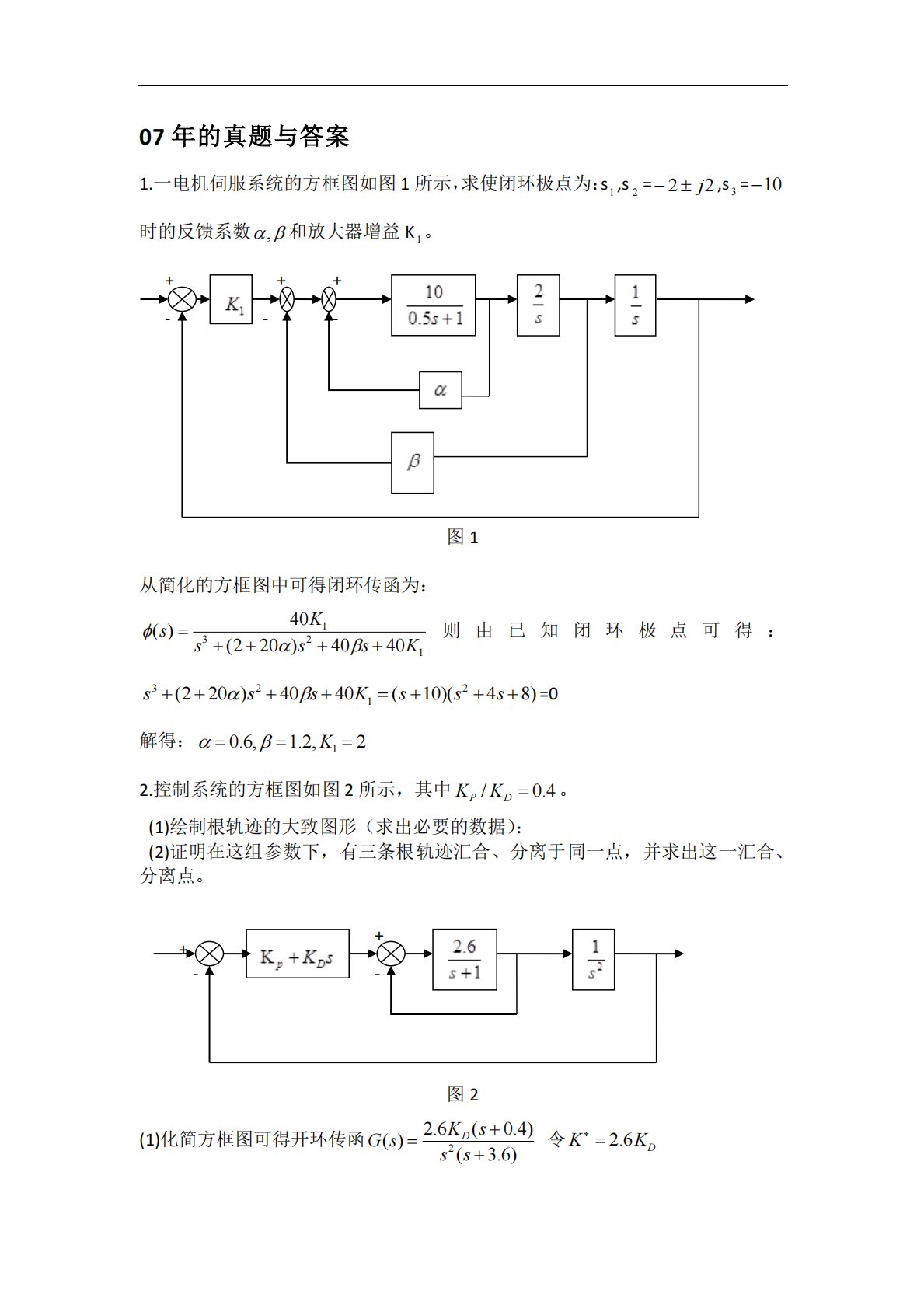 07年的真题与答案1.一电机伺服系统的方框图如图1所示,求使闭环极点为:s1,s2=j22,s3=10时的反馈系数,和放大器增益K1。图1从简化的方框图中可得闭环传函为:sKsssK()40(220)40401321则由已知闭环极点可得:sssKsss3212(220)4040(10)(48)=0解得:K10.6,1.2,22.控制系统的方框图如图2所示,其中KKPD/0.4。(1)绘制根轨迹的大致图形(求出必要的数据):(2)证明在这组参数下,有三条根轨迹汇合、分离于同一点,并求出这一汇合、分离点。图2(1)化简方框图可得开环传函DG...