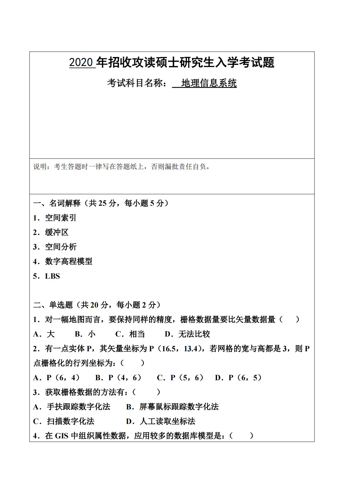 2020年招收攻读硕士研究生入学考试题考试科目名称:地理信息系统说明:考生答题时一律写在答题纸上,否则漏批责任自负。一、名词解释(共25分,每小题5分)1.空间索引2.缓冲区3.空间分析4.数字高程模型5.LBS二、单选题(共20分,每小题2分)1.对一幅地图而言,要保持同样的精度,栅格数据量要比矢量数据量()A.大B.小C.相当D.无法比较2.有一点实体P,其矢量坐标为P(16.5,13.4),若网格的宽与高都是3,则P点栅格化的行列坐标为:()A.P(6,4)B.P(4,6)C.P(5,6)D.P(6,5)3.获取栅格数据的方法有:()A.手扶跟踪数字化法B.屏幕鼠标跟踪数字化法C.扫描数...
