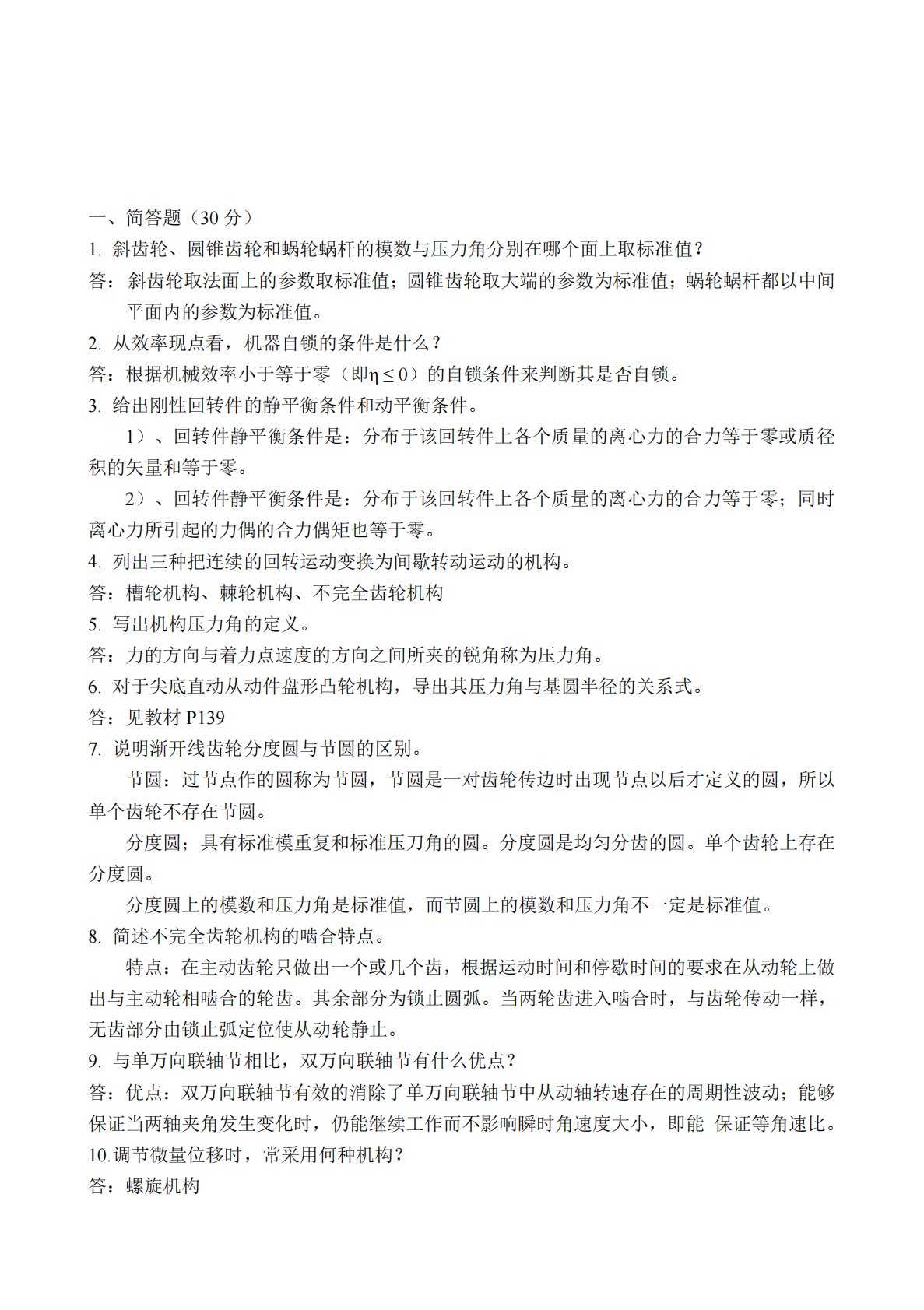 一、简答题(30分)1.斜齿轮、圆锥齿轮和蜗轮蜗杆的模数与压力角分别在哪个面上取标准值?答:斜齿轮取法面上的参数取标准值;圆锥齿轮取大端的参数为标准值;蜗轮蜗杆都以中间平面内的参数为标准值。2.从效率现点看,机器自锁的条件是什么?答:根据机械效率小于等于零(即η≤0)的自锁条件来判断其是否自锁。3.给出刚性回转件的静平衡条件和动平衡条件。1)、回转件静平衡条件是:分布于该回转件上各个质量的离心力的合力等于零或质径积的矢量和等于零。2)、回转件静平衡条件是:分布于该回转件上各个质量的离心力的合力等于零;同时离心力所引起的力偶的合力偶矩也等于零。4.列出三种把连续的回转运动变换为间歇转动运动的机构...