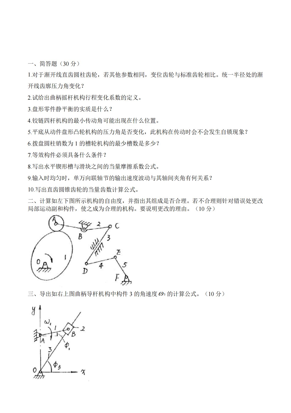 一、简答题(30分)1.对于渐开线直齿圆柱齿轮,若其他参数相同,变位齿轮与标准齿轮相比。统一半径处的渐开线齿廓压力角变化?2.试给出曲柄摇杆机构行程变化系数的定义。3.盘形零件静平衡的实质是什么?4.铰链四杆机构的最小传动角可能出现在什么位置。5.平底从动件盘形凸轮机构的压力角是否变化,此机构在传动时会不会发生自锁现象?6.拨盘圆柱销数为1的槽轮机构的最少槽数是多少?7.等效构件必须具备什么条件?8.写出水平锲形槽与滑块之间的当量摩擦系数公式。9.输入时均匀时,单万向联轴节的输出速度波动与其轴间夹角有何关系?10.写出直齿圆锥齿轮的当量齿数计算公式。二、计算如左下图所示机构的自由度,并指出其组...