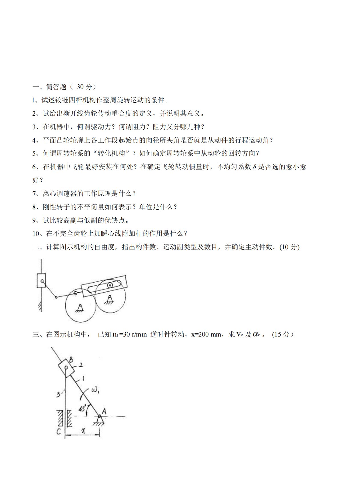 一、简答题(30分)l、试述铰链四杆机构作整周旋转运动的条件。2、试给出渐开线齿轮传动重合度的定义,并说明其意义。3、在机器中,何谓驱动力?何谓阻力?阻力又分哪儿种?4、平面凸轮轮廓上各工作段起始点的向径所夹角是否就是从动件的行程运动角?5、何谓周转轮系的“转化机构”?如何确定周转轮系中从动轮的回转方向?6、在机器中飞轮最好安装在何处?在确定飞轮转动惯量时,不均匀系数是否选的愈小愈好?7、离心调速器的工作原理是什么?8、刚性转子的不平衡量如何表示?单位是什么?9、试比较高副与低副的优缺点。10、在不完全齿轮上加瞬心线附加杆的作用是什么?二、计算图示机构的自由度,指出构件数、运动副类型及数目,...