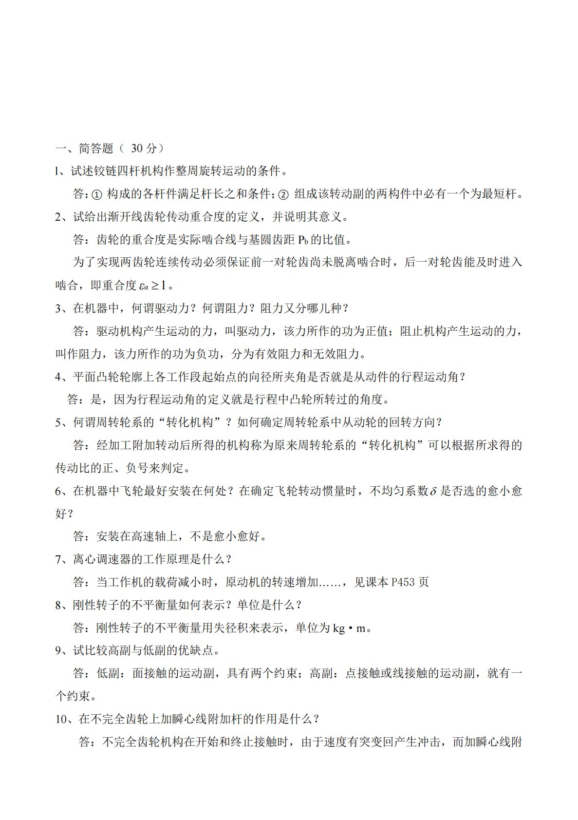 一、简答题(30分)l、试述铰链四杆机构作整周旋转运动的条件。答:①构成的各杆件满足杆长之和条件;②组成该转动副的两构件中必有一个为最短杆。2、试给出渐开线齿轮传动重合度的定义,并说明其意义。答:齿轮的重合度是实际啮合线与基圆齿距Pb的比值。为了实现两齿轮连续传动必须保证前一对轮齿尚未脱离啮合时,后一对轮齿能及时进入啮合,即重合度1αε。3、在机器中,何谓驱动力?何谓阻力?阻力又分哪儿种?答:驱动机构产生运动的力,叫驱动力,该力所作的功为正值;阻止机构产生运动的力,叫作阻力,该力所作的功为负功,分为有效阻力和无效阻力。4、平面凸轮轮廓上各工作段起始点的向径所夹角是否就是从动件的行程运动角?答...