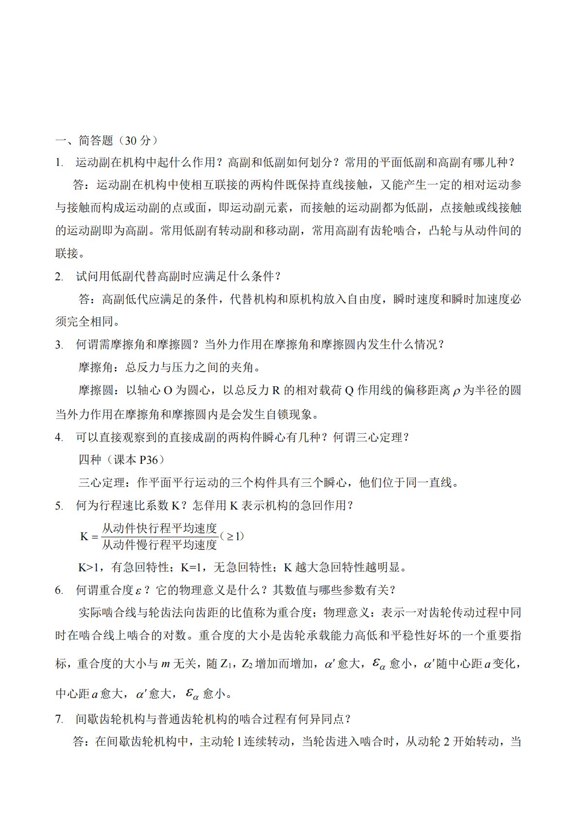 一、简答题(30分)1.运动副在机构中起什么作用?高副和低副如何划分?常用的平面低副和高副有哪儿种?答:运动副在机构中使相互联接的两构件既保持直线接触,又能产生一定的相对运动参与接触而构成运动副的点或面,即运动副元素,而接触的运动副都为低副,点接触或线接触的运动副即为高副。常用低副有转动副和移动副,常用高副有齿轮啮合,凸轮与从动件间的联接。2.试问用低副代替高副时应满足什么条件?答:高副低代应满足的条件,代替机构和原机构放入自由度,瞬时速度和瞬时加速度必须完全相同。3.何谓需摩擦角和摩擦圆?当外力作用在摩擦角和摩擦圆内发生什么情况?摩擦角:总反力与压力之间的夹角。摩擦圆:以轴心O为圆心,以总反...