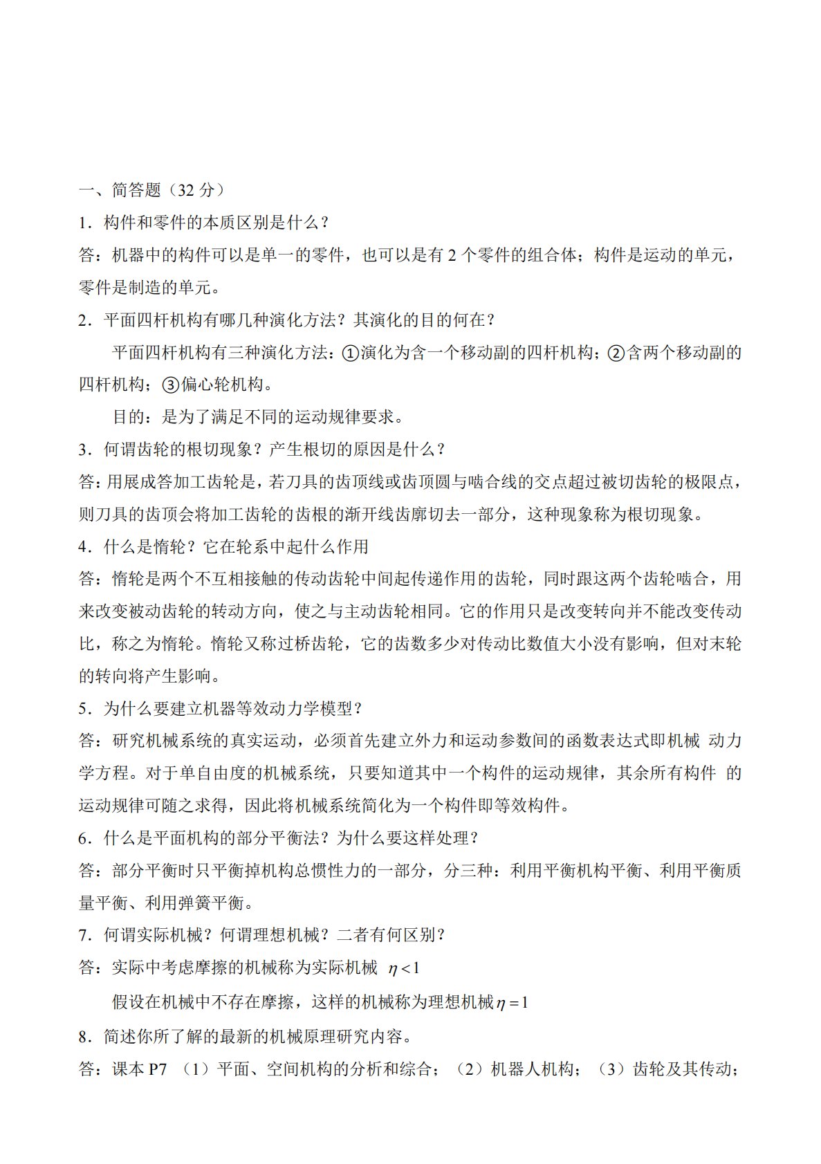 一、简答题(32分)1.构件和零件的本质区别是什么?答:机器中的构件可以是单一的零件,也可以是有2个零件的组合体;构件是运动的单元,零件是制造的单元。2.平面四杆机构有哪几种演化方法?其演化的目的何在?平面四杆机构有三种演化方法:①演化为含一个移动副的四杆机构;②含两个移动副的四杆机构;③偏心轮机构。目的:是为了满足不同的运动规律要求。3.何谓齿轮的根切现象?产生根切的原因是什么?答:用展成答加工齿轮是,若刀具的齿顶线或齿顶圆与啮合线的交点超过被切齿轮的极限点,则刀具的齿顶会将加工齿轮的齿根的渐开线齿廓切去一部分,这种现象称为根切现象。4.什么是惰轮?它在轮系中起什么作用答:惰轮是两个不互相接...