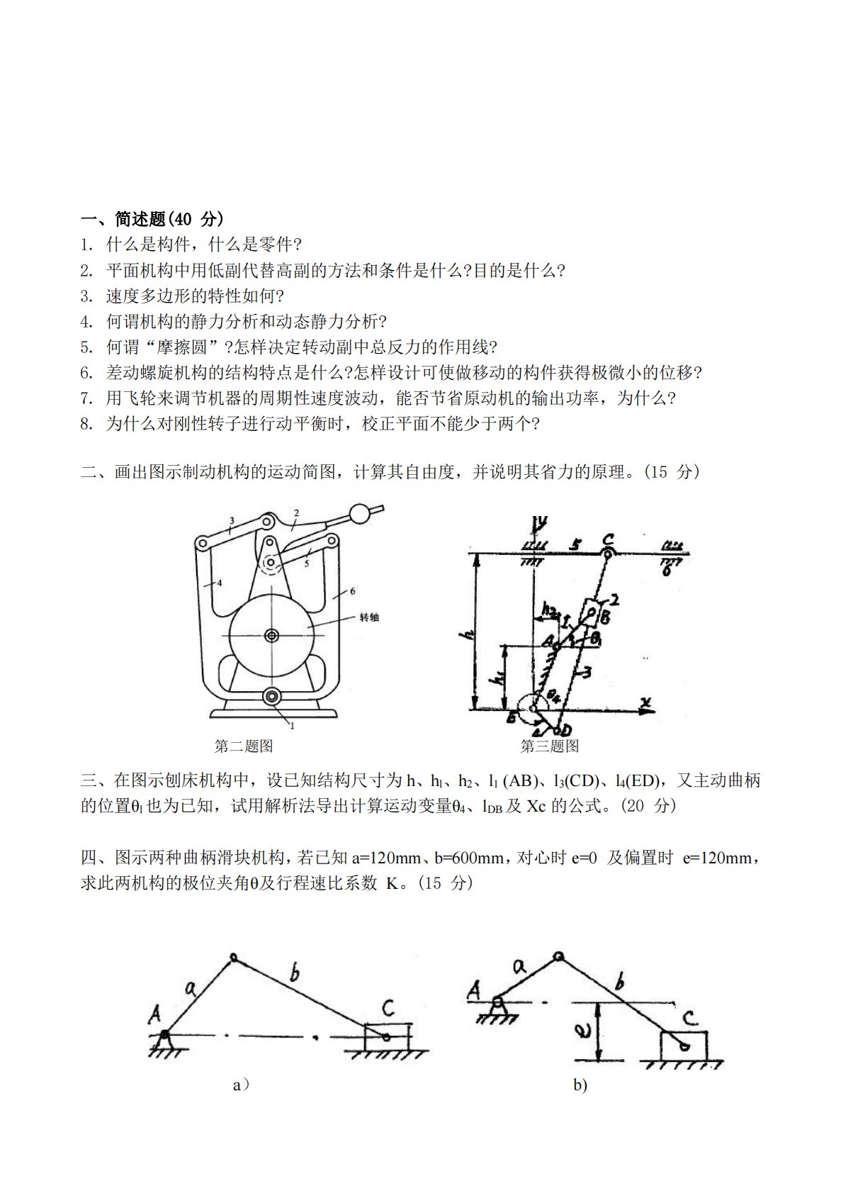 一、简述题(40分)1.什么是构件,什么是零件?2.平面机构中用低副代替高副的方法和条件是什么?目的是什么?3.速度多边形的特性如何?4.何谓机构的静力分析和动态静力分析?5.何谓“摩擦圆”?怎样决定转动副中总反力的作用线?6.差动螺旋机构的结构特点是什么?怎样设计可使做移动的构件获得极微小的位移?7.用飞轮来调节机器的周期性速度波动,能否节省原动机的输出功率,为什么?8.为什么对刚性转子进行动平衡时,校正平面不能少于两个?二、画出图示制动机构的运动简图,计算其自由度,并说明其省力的原理。(15分)第二题图第三题图三、在图示刨床机构中,设已知结构尺寸为h、hl、h2、l1(AB)、l3(CD)...