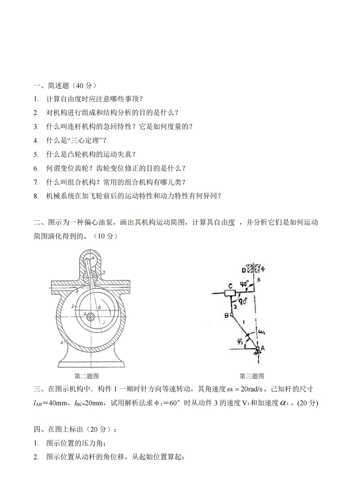 一、简述题(40分)1.计算自由度时应注意哪些事顶?2.对机构进行组成和结构分析的目的是什么?3.什么叫连杆机构的急回恃性?它是如何度量的?4.什么是“三心定理”?5.什么是凸轮机构的运动失真?6.何谓变位齿轮?齿轮变位修正的目的是什么?7.什么叫组合机构?常用的组合机构有哪儿类?8.机械系统在加飞轮前后的运动特性和动力特性有何异同?二、图示为一种偏心油泵,画出其机构运动简图,计算其自由度,并分析它们是如何运动简图演化得到的。(10分)第二题图第三题图三、在图示机构中.构件1一顺时针方向等速转动,其角速度rad/s201。己知杆的尺寸lAB=40mm,lBC=20mm,试用解析法求φ1=6...