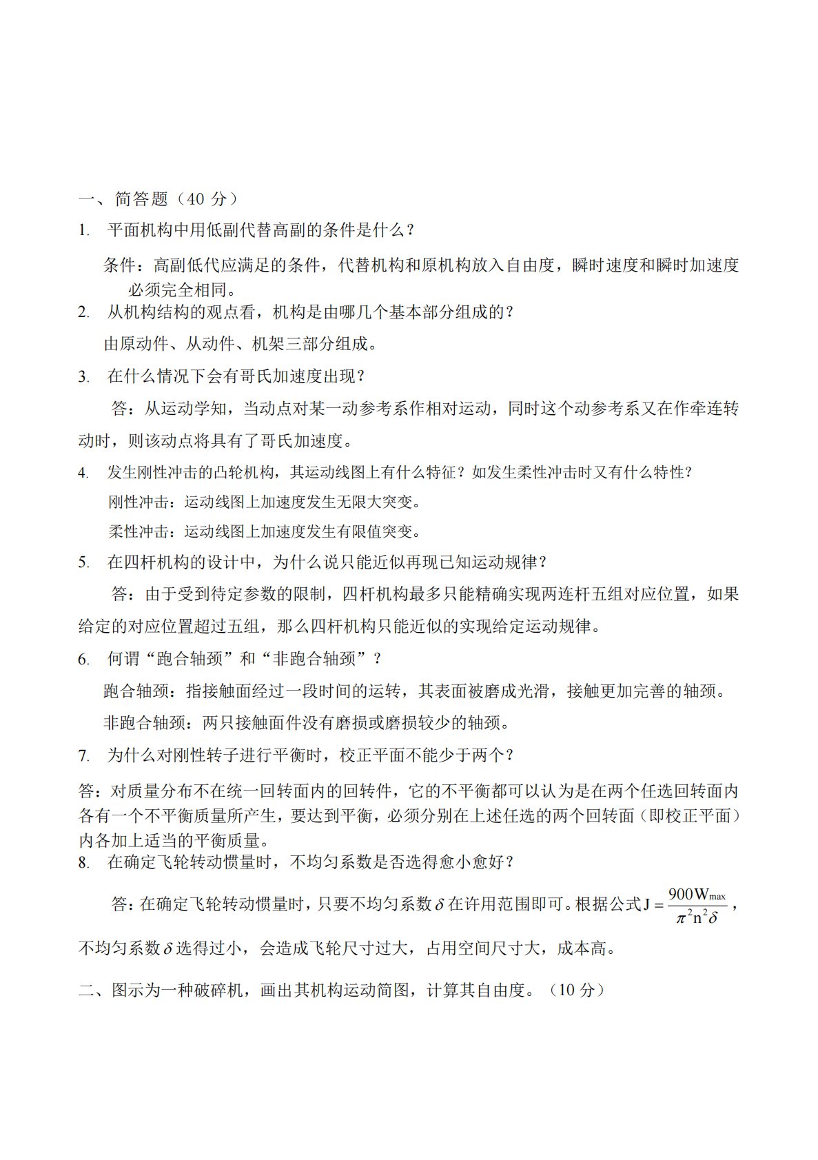 一、简答题(40分)1.平面机构中用低副代替高副的条件是什么?条件:高副低代应满足的条件,代替机构和原机构放入自由度,瞬时速度和瞬时加速度必须完全相同。2.从机构结构的观点看,机构是由哪几个基本部分组成的?由原动件、从动件、机架三部分组成。3.在什么情况下会有哥氏加速度出现?答:从运动学知,当动点对某一动参考系作相对运动,同时这个动参考系又在作牵连转动时,则该动点将具有了哥氏加速度。4.发生刚性冲击的凸轮机构,其运动线图上有什么特征?如发生柔性冲击时又有什么特性?刚性冲击:运动线图上加速度发生无限大突变。柔性冲击:运动线图上加速度发生有限值突变。5.在四杆机构的设计中,为什么说只能近似再现已知...