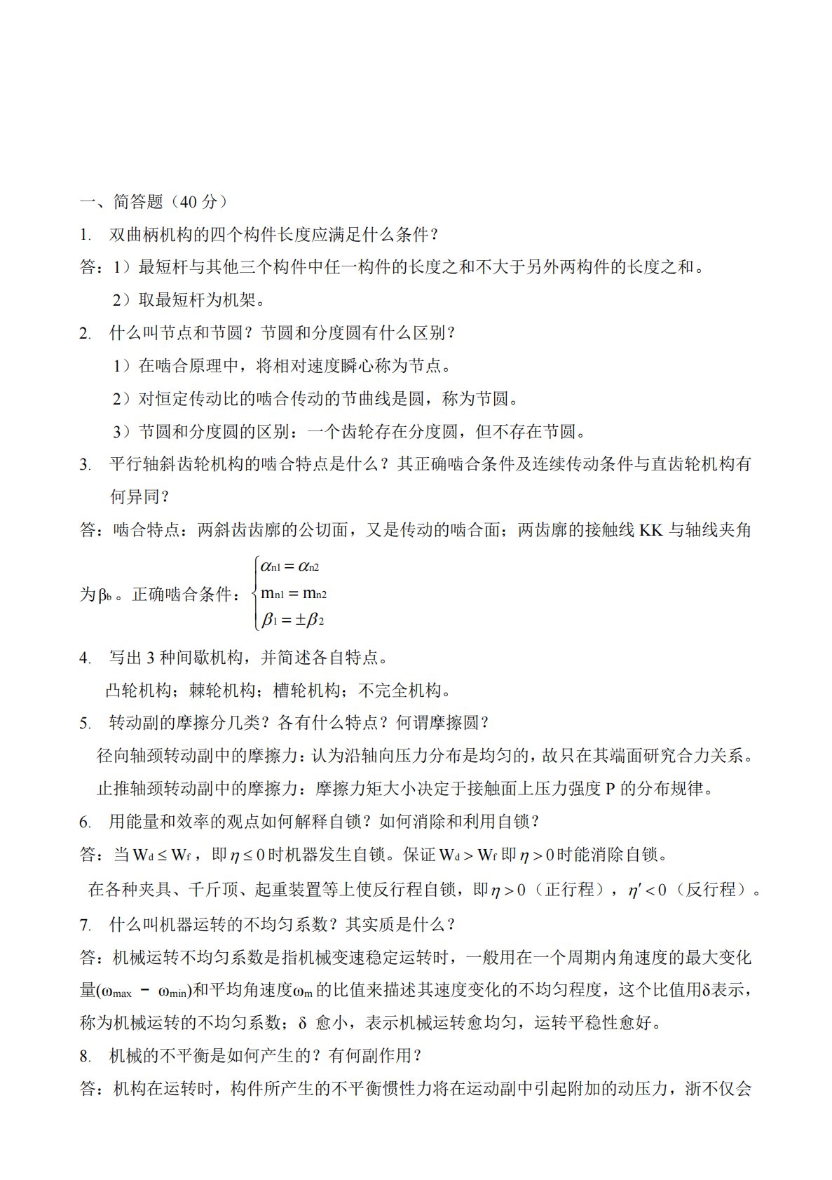 一、简答题(40分)1.双曲柄机构的四个构件长度应满足什么条件?答:1)最短杆与其他三个构件中任一构件的长度之和不大于另外两构件的长度之和。2)取最短杆为机架。2.什么叫节点和节圆?节圆和分度圆有什么区别?1)在啮合原理中,将相对速度瞬心称为节点。2)对恒定传动比的啮合传动的节曲线是圆,称为节圆。3)节圆和分度圆的区别:一个齿轮存在分度圆,但不存在节圆。3.平行轴斜齿轮机构的啮合特点是什么?其正确啮合条件及连续传动条件与直齿轮机构有何异同?答:啮合特点:两斜齿齿廓的公切面,又是传动的啮合面;两齿廓的接触线KK与轴线夹角为bβ。正确啮合条件:21n2n1n2n1mm4....