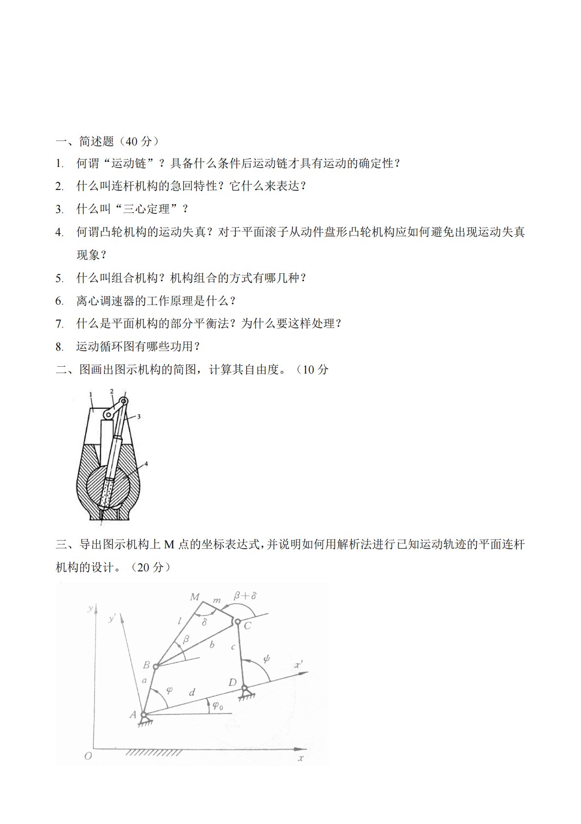 一、简述题(40分)1.何谓“运动链”?具备什么条件后运动链才具有运动的确定性?2.什么叫连杆机构的急回特性?它什么来表达?3.什么叫“三心定理”?4.何谓凸轮机构的运动失真?对于平面滚子从动件盘形凸轮机构应如何避免出现运动失真现象?5.什么叫组合机构?机构组合的方式有哪几种?6.离心调速器的工作原理是什么?7.什么是平面机构的部分平衡法?为什么要这样处理?8.运动循环图有哪些功用?二、图画出图示机构的简图,计算其自由度。(10分三、导出图示机构上M点的坐标表达式,并说明如何用解析法进行已知运动轨迹的平面连杆机构的设计。(20分)四、在图示的三个凸轮机构,已知R=40mm,a=20mm,e=1...