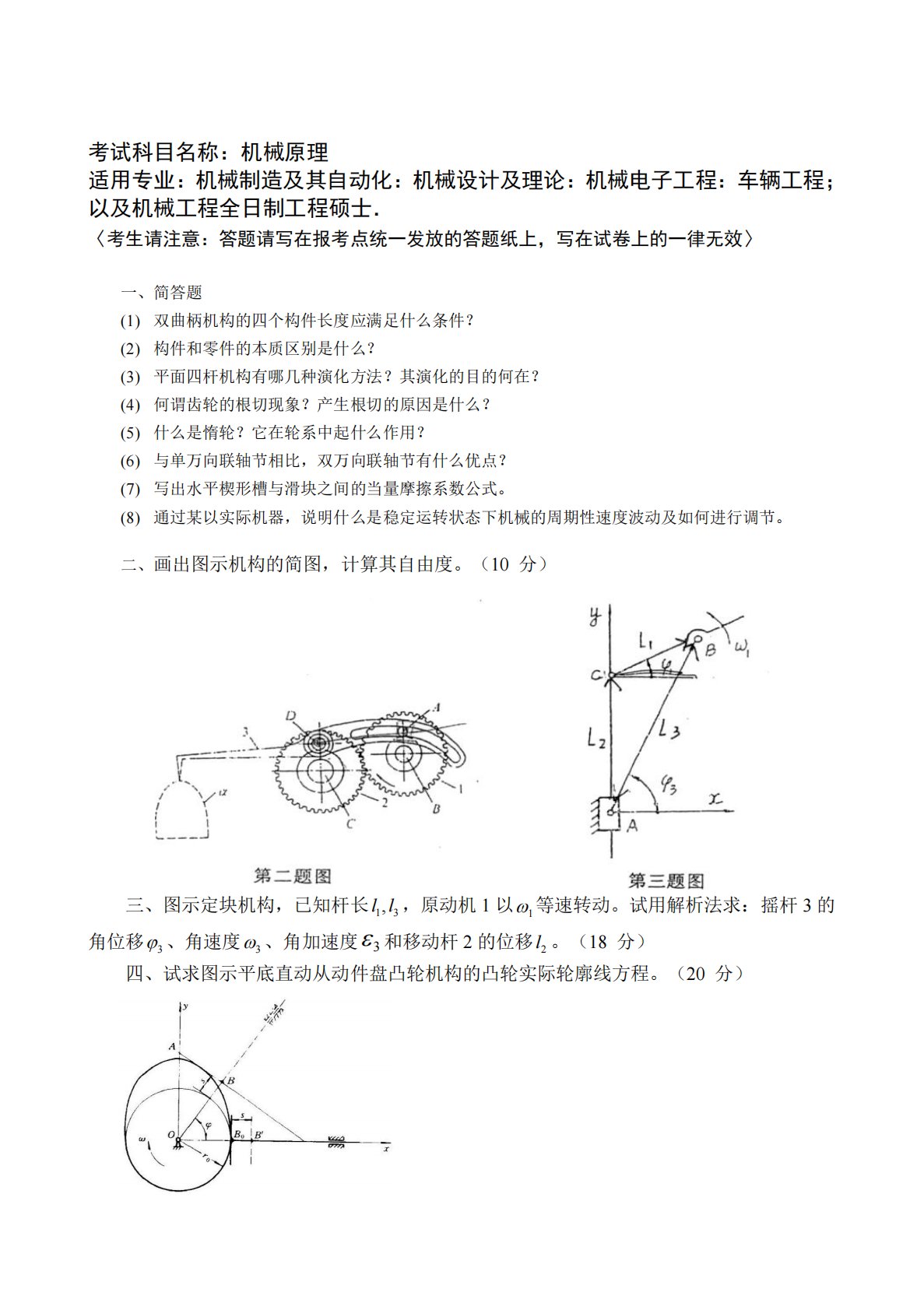 考试科目名称:机械原理适用专业:机械制造及其自动化:机械设计及理论:机械电子工程:车辆工程;以及机械工程全日制工程硕士.〈考生请注意:答题请写在报考点统一发放的答题纸上,写在试卷上的一律无效〉一、简答题(1)双曲柄机构的四个构件长度应满足什么条件?(2)构件和零件的本质区别是什么?(3)平面四杆机构有哪几种演化方法?其演化的目的何在?(4)何谓齿轮的根切现象?产生根切的原因是什么?(5)什么是惰轮?它在轮系中起什么作用?(6)与单万向联轴节相比,双万向联轴节有什么优点?(7)写出水平楔形槽与滑块之间的当量摩擦系数公式。(8)通过某以实际机器,说明什么是稳定运转状态下机械的周期性速度波动及如何进...