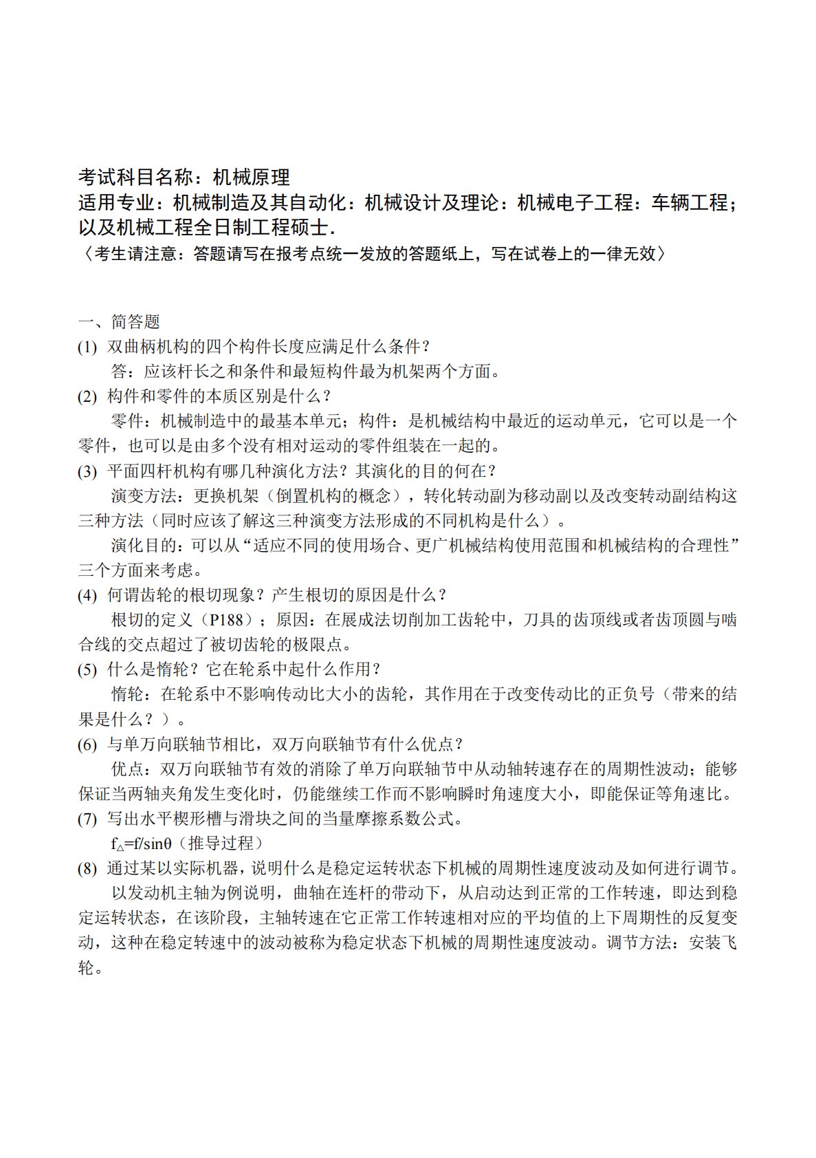 考试科目名称:机械原理适用专业:机械制造及其自动化:机械设计及理论:机械电子工程:车辆工程;以及机械工程全日制工程硕士.〈考生请注意:答题请写在报考点统一发放的答题纸上,写在试卷上的一律无效〉一、简答题(1)双曲柄机构的四个构件长度应满足什么条件?答:应该杆长之和条件和最短构件最为机架两个方面。(2)构件和零件的本质区别是什么?零件:机械制造中的最基本单元;构件:是机械结构中最近的运动单元,它可以是一个零件,也可以是由多个没有相对运动的零件组装在一起的。(3)平面四杆机构有哪几种演化方法?其演化的目的何在?演变方法:更换机架(倒置机构的概念),转化转动副为移动副以及改变转动副结构这三种方法(同...