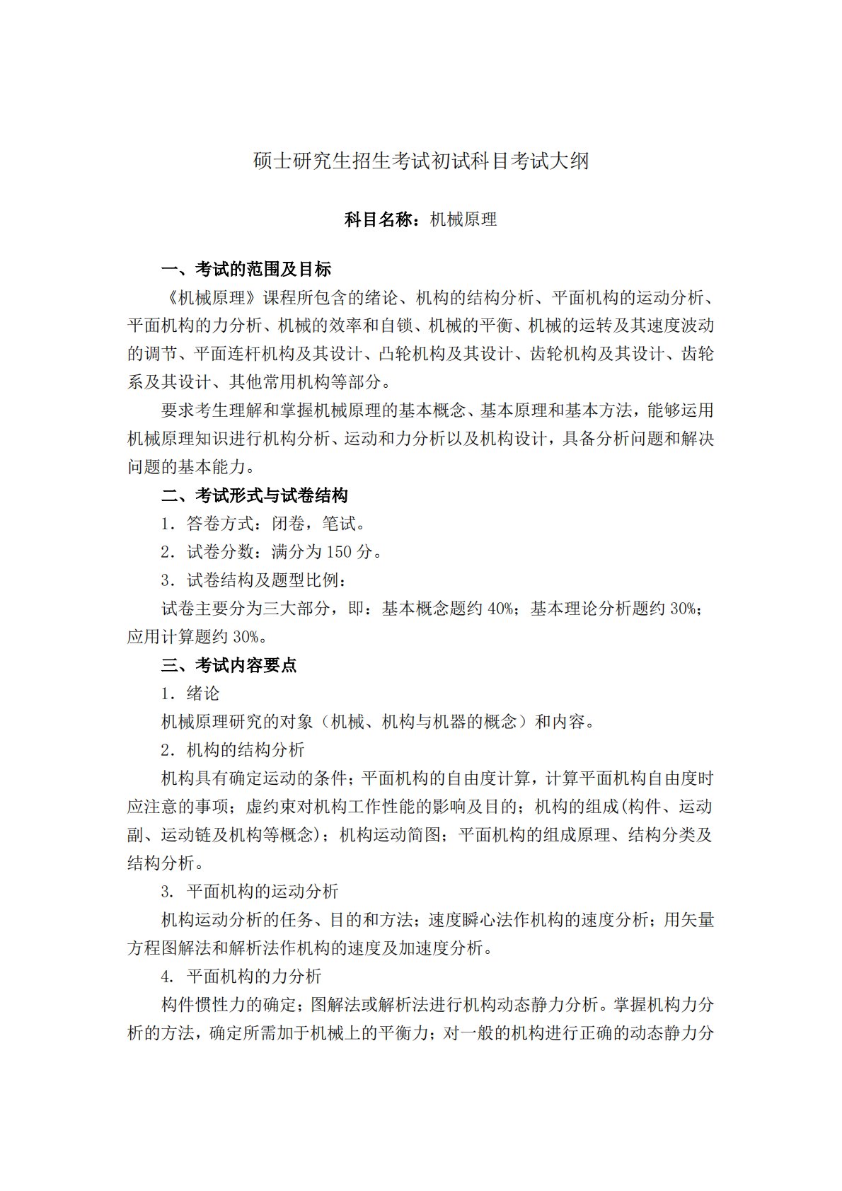 硕士研究生招生考试初试科目考试大纲科目名称:机械原理一、考试的范围及目标《机械原理》课程所包含的绪论、机构的结构分析、平面机构的运动分析、平面机构的力分析、机械的效率和自锁、机械的平衡、机械的运转及其速度波动的调节、平面连杆机构及其设计、凸轮机构及其设计、齿轮机构及其设计、齿轮系及其设计、其他常用机构等部分。要求考生理解和掌握机械原理的基本概念、基本原理和基本方法,能够运用机械原理知识进行机构分析、运动和力分析以及机构设计,具备分析问题和解决问题的基本能力。二、考试形式与试卷结构1.答卷方式:闭卷,笔试。2.试卷分数:满分为150分。3.试卷结构及题型比例:试卷主要分为三大部分,即:基本概念题...