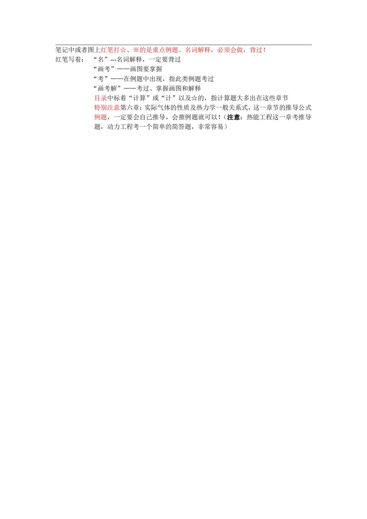 笔记中或者图上红笔打☆、※的是重点例题、名词解释,必须会做,背过!红笔写着:“名”---名词解释,一定要背过“画考”——画图要掌握“考”——在例题中出现,指此类例题考过“画考解”——考过、掌握画图和解释目录中标着“计算”或“计”以及☆的,指计算题大多出在这些章节特别注意第六章:实际气体的性质及热力学一般关系式,这一章节的推导公式例题,一定要会自己推导,会推例题就可以!(注意:热能工程这一章考推导题,动力工程考一个简单的简答题,非常容易)百校文库—海量高校资料共享库百校文库是一个线上大学生专业学习资料共享平台,致力于通过用户自主上传与分享,打造一个涵盖各大高校、各学科门类的免费资源中心。平台已积...
