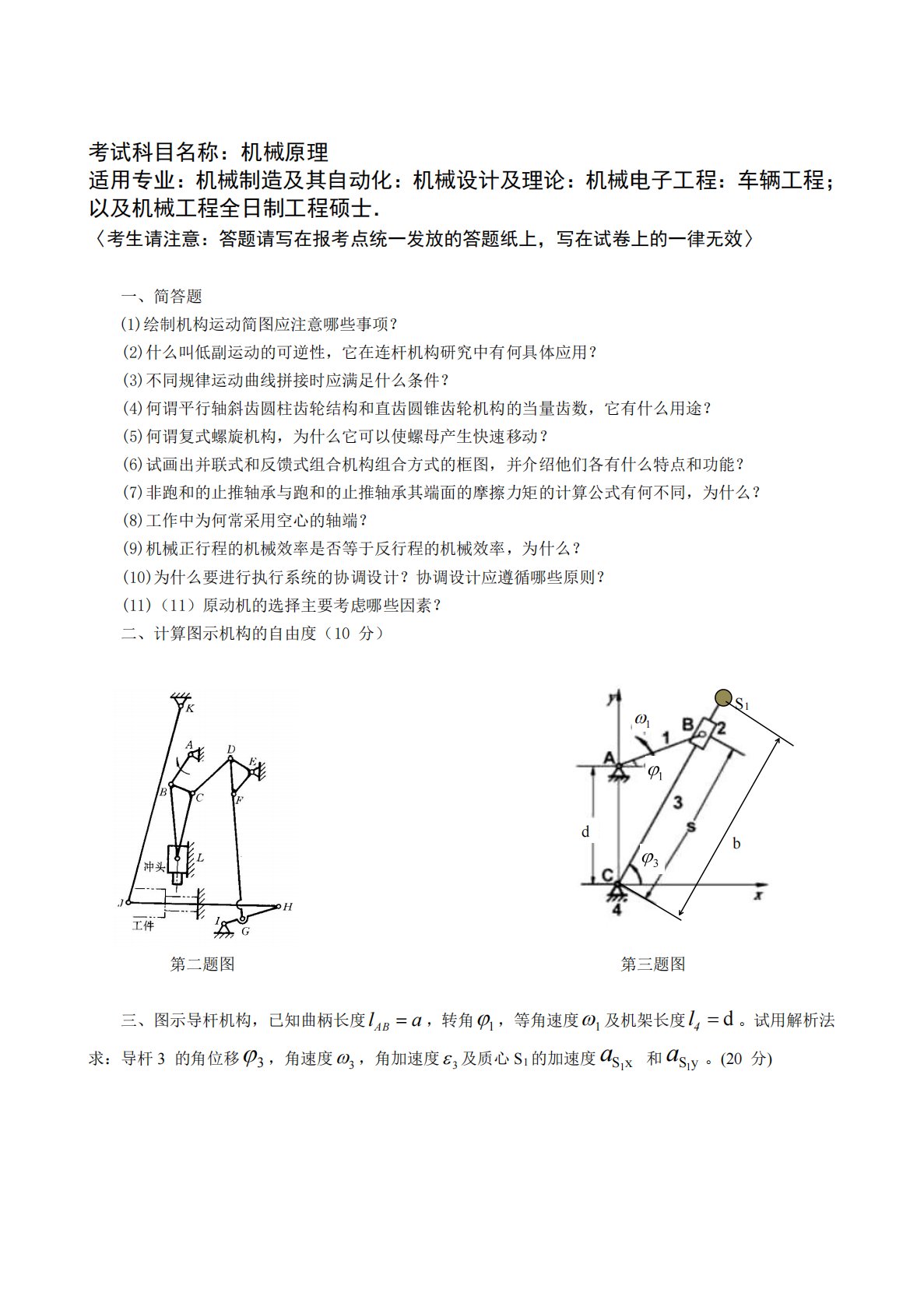 考试科目名称:机械原理适用专业:机械制造及其自动化:机械设计及理论:机械电子工程:车辆工程;以及机械工程全日制工程硕士.〈考生请注意:答题请写在报考点统一发放的答题纸上,写在试卷上的一律无效〉一、简答题(1)绘制机构运动简图应注意哪些事项?(2)什么叫低副运动的可逆性,它在连杆机构研究中有何具体应用?(3)不同规律运动曲线拼接时应满足什么条件?(4)何谓平行轴斜齿圆柱齿轮结构和直齿圆锥齿轮机构的当量齿数,它有什么用途?(5)何谓复式螺旋机构,为什么它可以使螺母产生快速移动?(6)试画出并联式和反馈式组合机构组合方式的框图,并介绍他们各有什么特点和功能?(7)非跑和的止推轴承与跑和的止推轴承其端...