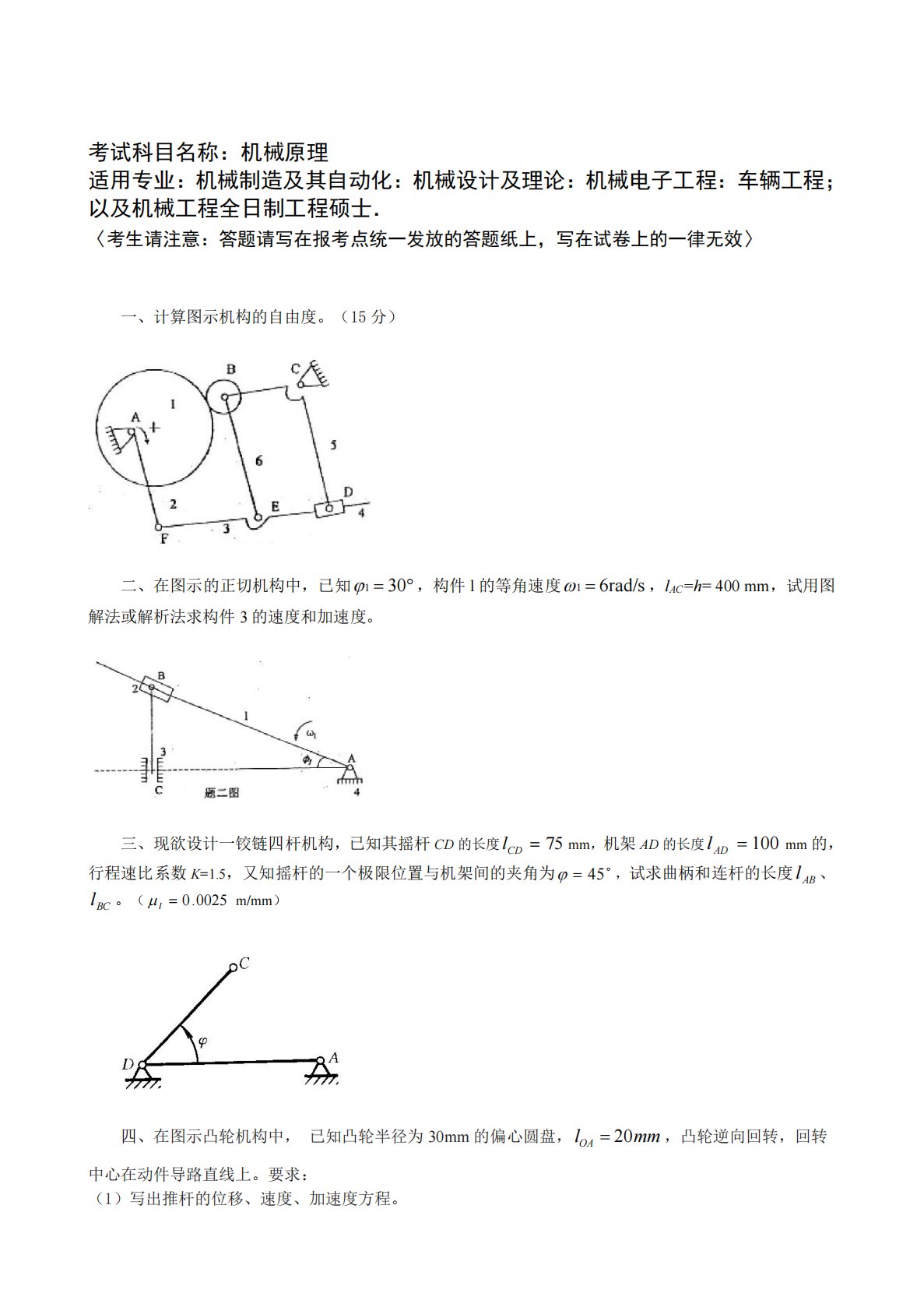 考试科目名称:机械原理适用专业:机械制造及其自动化:机械设计及理论:机械电子工程:车辆工程;以及机械工程全日制工程硕士.〈考生请注意:答题请写在报考点统一发放的答题纸上,写在试卷上的一律无效〉一、计算图示机构的自由度。(15分)二、在图示的正切机构中,已知301,构件l的等角速度rad/s61,lAC=h=400mm,试用图解法或解析法求构件3的速度和加速度。三、现欲设计一铰链四杆机构,已知其摇杆CD的长度75CDlmm,机架AD的长度100ADlmm的,行程速比系数K=1.5,又知摇杆的一个极限位置与机架间的夹角为45,试求曲柄和连杆的长度ABl、BCl。(0025.0...