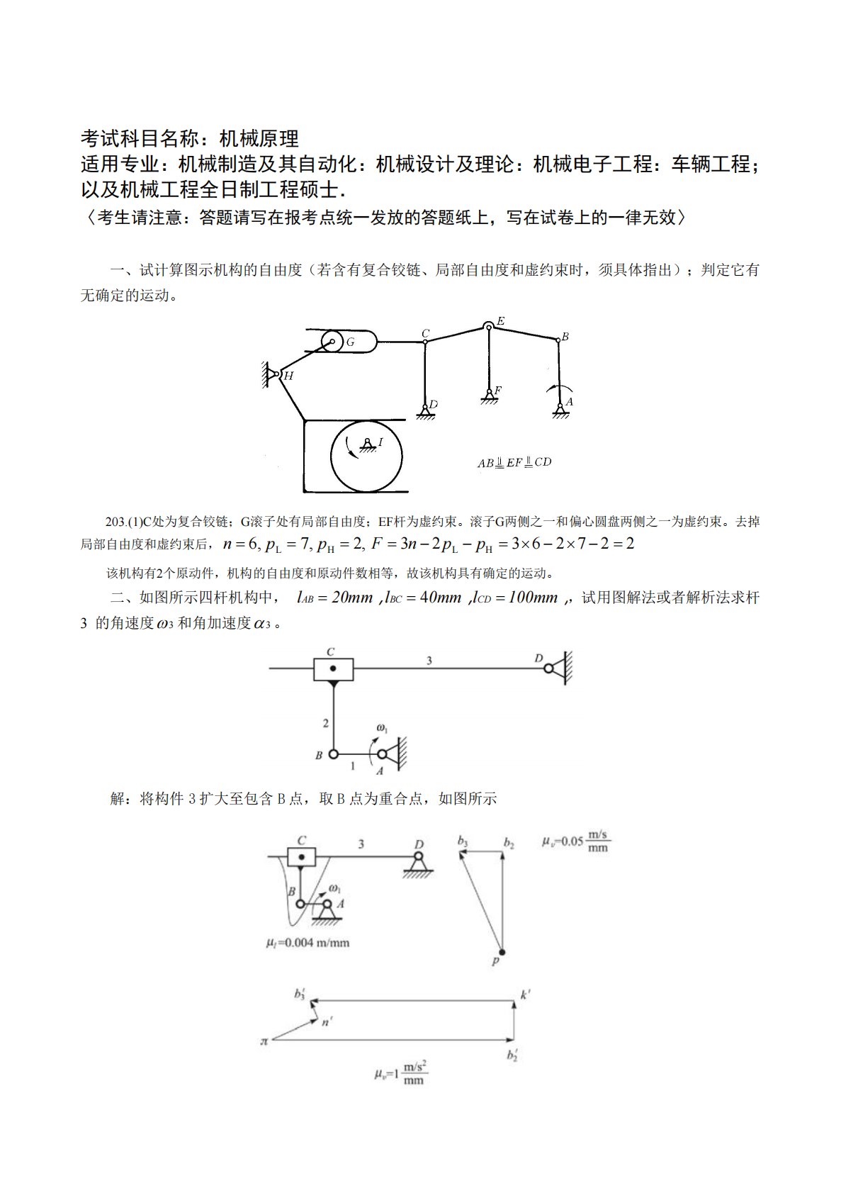 考试科目名称:机械原理适用专业:机械制造及其自动化:机械设计及理论:机械电子工程:车辆工程;以及机械工程全日制工程硕士.〈考生请注意:答题请写在报考点统一发放的答题纸上,写在试卷上的一律无效〉一、试计算图示机构的自由度(若含有复合铰链、局部自由度和虚约束时,须具体指出);判定它有无确定的运动。203.(1)C处为复合铰链;G滚子处有局部自由度;EF杆为虚约束。滚子G两侧之一和偏心圆盘两侧之一为虚约束。去掉局部自由度和虚约束后,,2,7,6HLppn22726323HLppnF该机构有2个原动件,机构的自由度和原动件数相等,故该机构具有确定的运动。二、如图所示四杆机构中,...