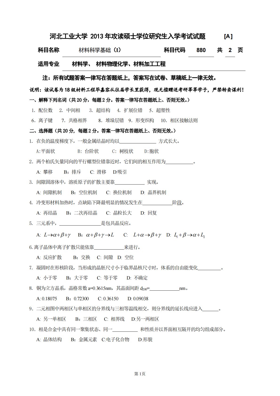 第1页河北工业大学2013年攻读硕士学位研究生入学考试试题[A]科目名称材料科学基础(І)科目代码880共2页适用专业材料学、材料物理化学、材料加工工程注:所有试题答案一律写在答题纸上,答案写在试卷、草稿纸上一律无效。说明:该试卷为18级材料工程毕嘉容从往届学长里获得,现无偿赠送考研莘莘学子,严禁转卖谋利!一、解释下列名词(共20分,每题2分。答案一律写在答题纸上、否则无效。)1.配位数2.中间相3.超结构4.扩展位错5.超塑性6.离子键7.共格相界8.堆垛层错9.形变织构10.相区接触法则二、选择题(共20分,每题2分。答案一律写在答题纸上、否则无效。)1.在负的温度梯度下,一般金属结晶时均...
